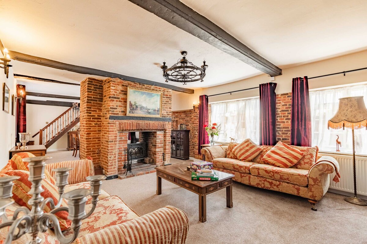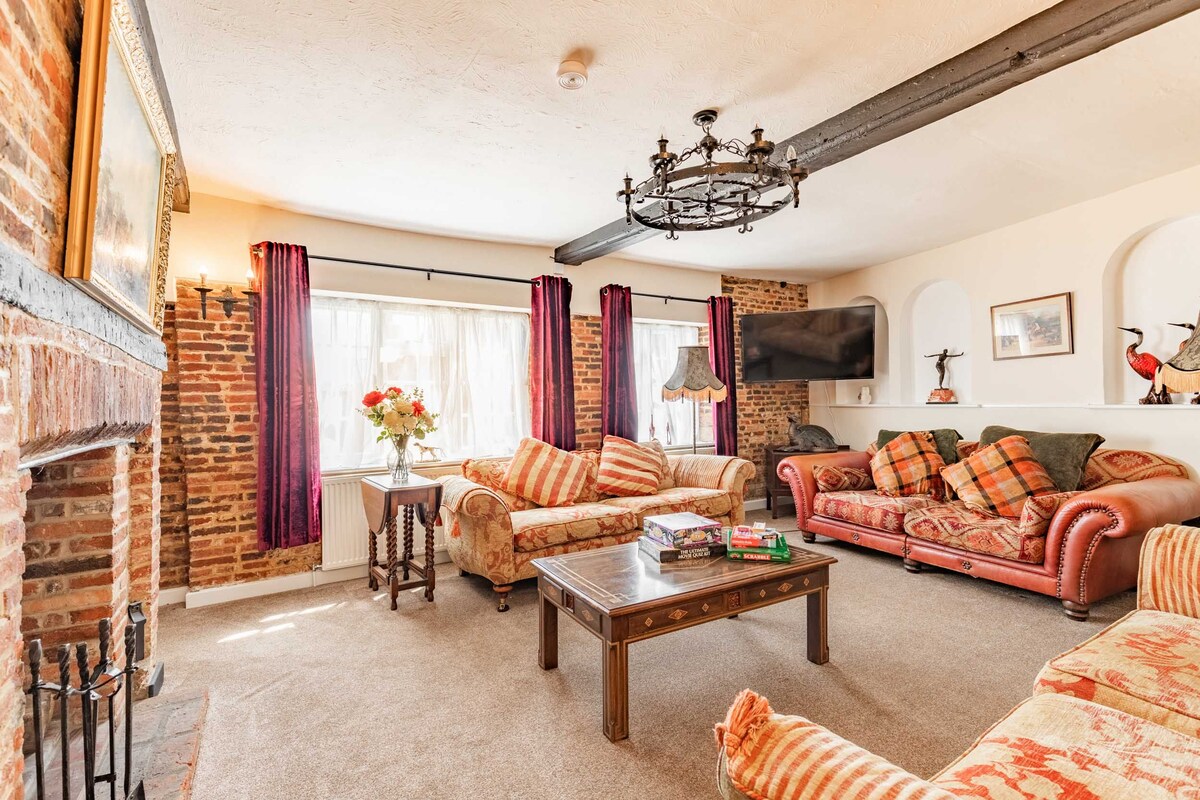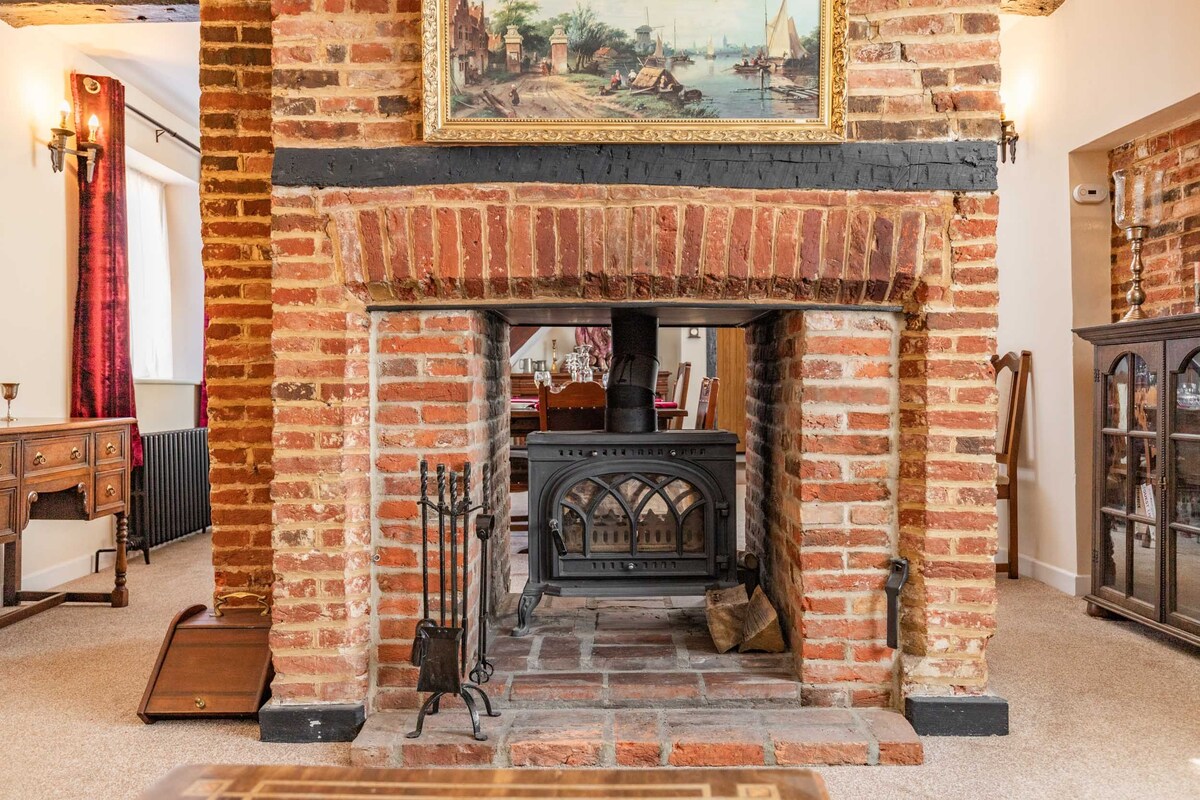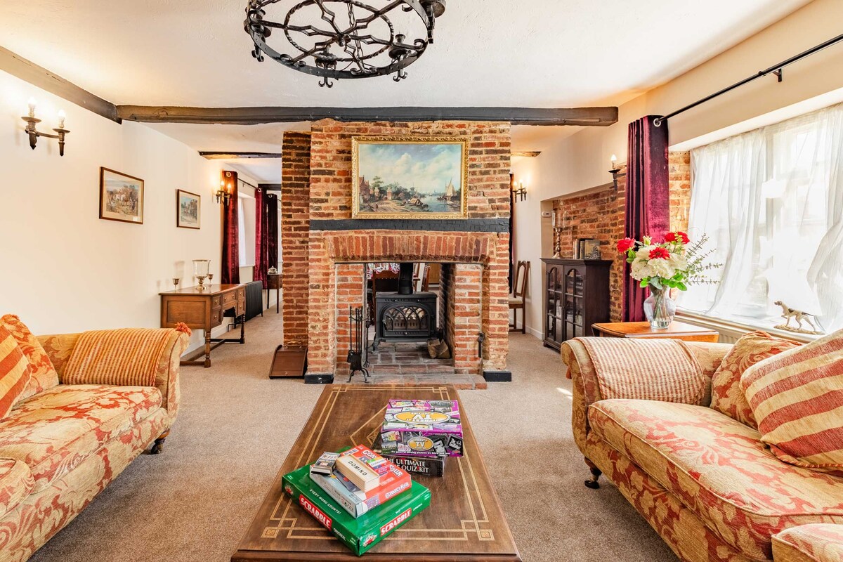 The elegant dining room features a long wooden table by a charming brick fireplace, adorned with a chandelier, creating a lovely setting for memorable meals.