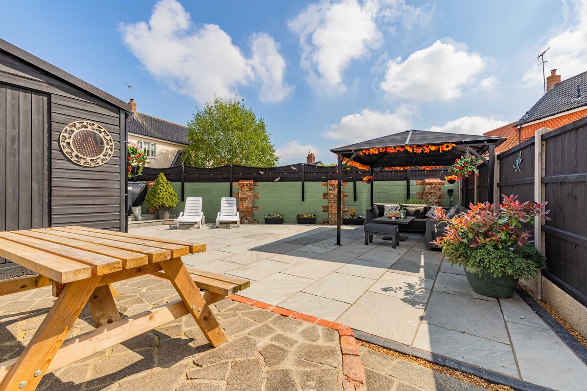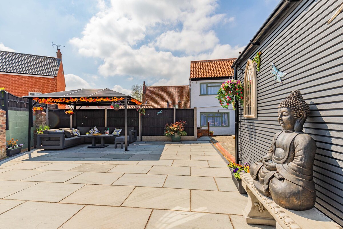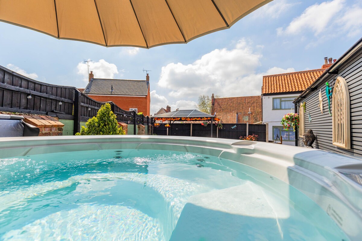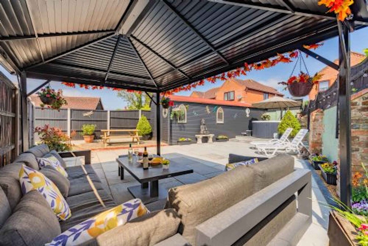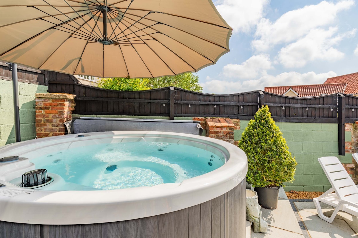 Step into the private outdoor oasis, complete with a hot tub, comfortable seating, and a charcoal BBQ for al fresco dining.