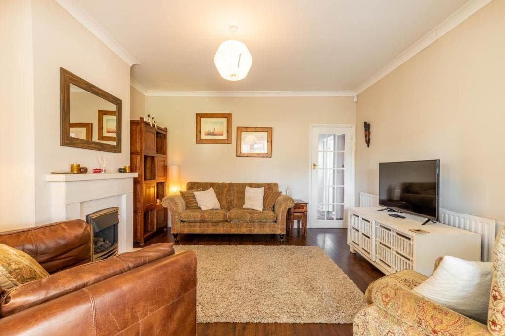 The living area offers two cosy sofas, a gas fireplace, and a smart TV for all your streaming needs.The open-plan kitchen and dining area create a warm space for family meals. The fully equipped kitchen makes meal prep easy, and the dining table provides plenty of seating for everyone.
