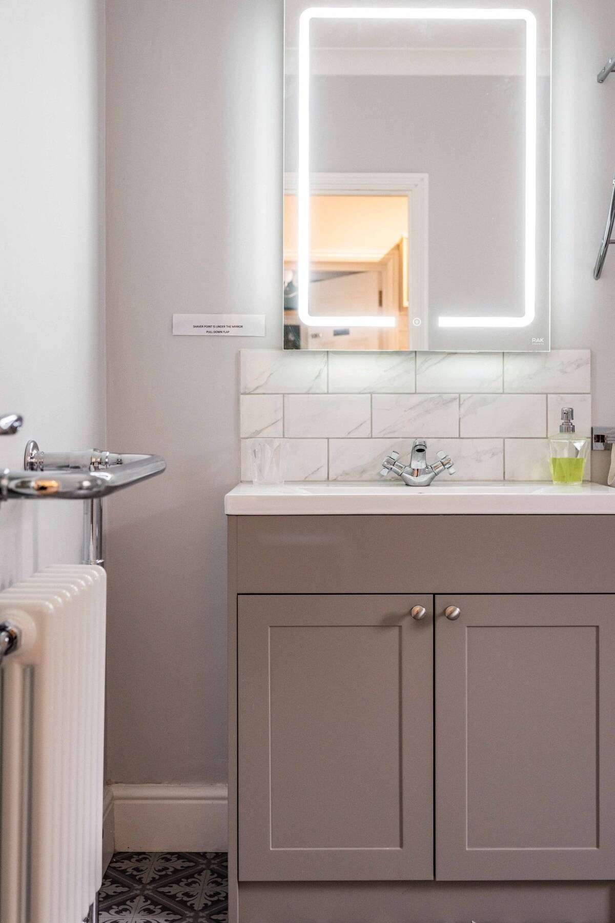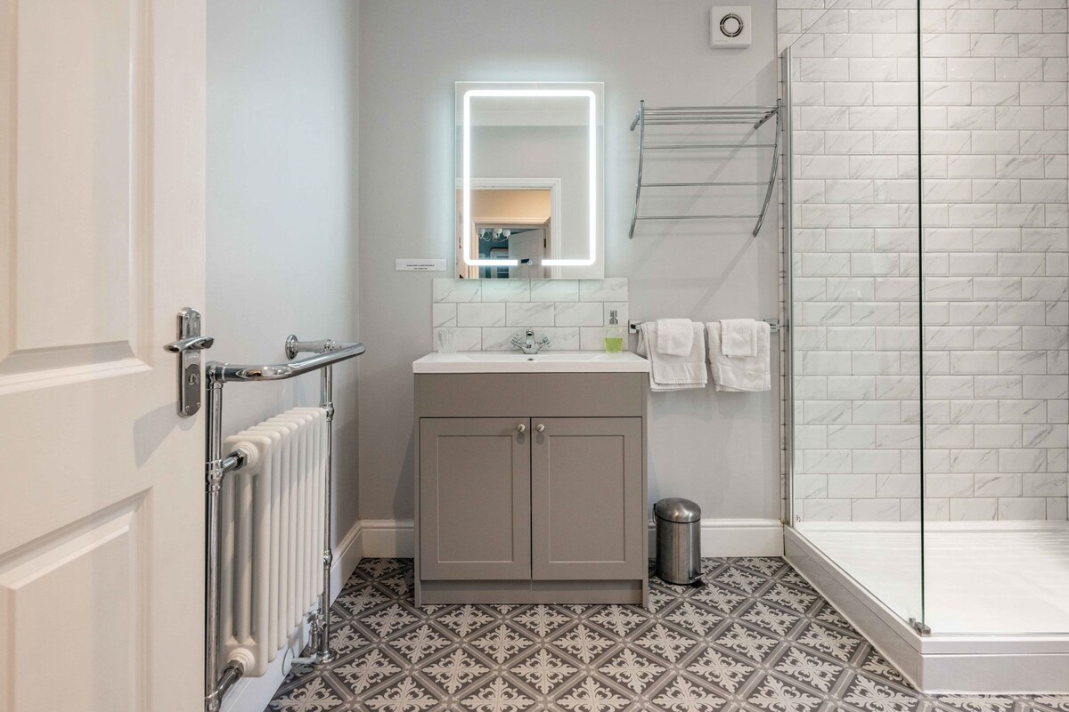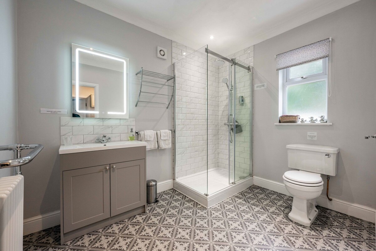 A large bathroom with a rainfall shower is situated just off the kitchen.