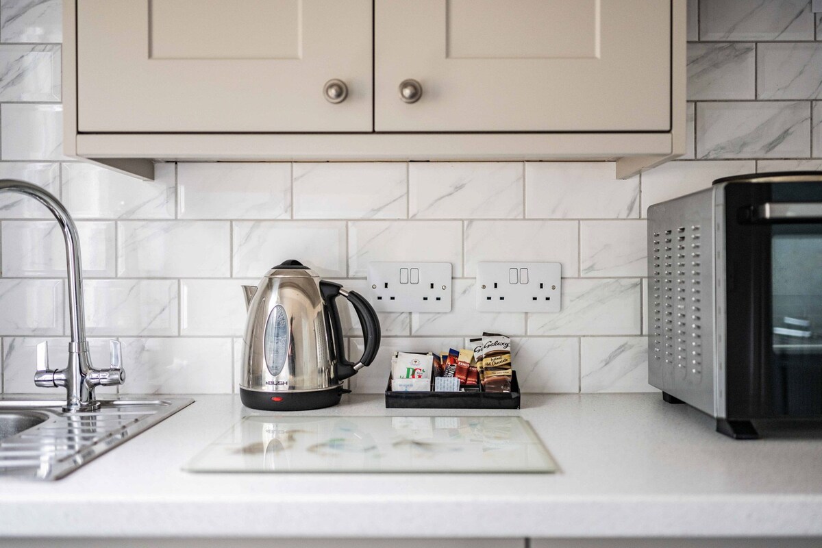 The kitchenette, located at the entrance, includes a kettle, toaster, microwave oven, two hobs, fridge, and sink.