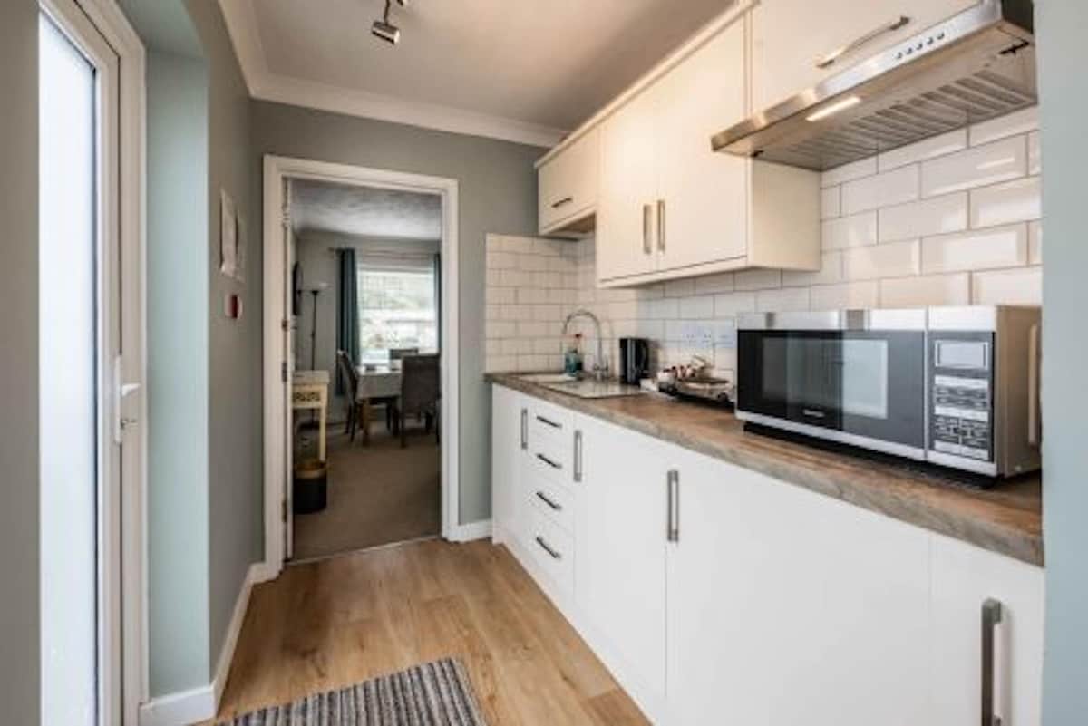 The well-equipped kitchenette includes a fridge with freezer compartment, microwave, toaster, kettle, and portable double hob.