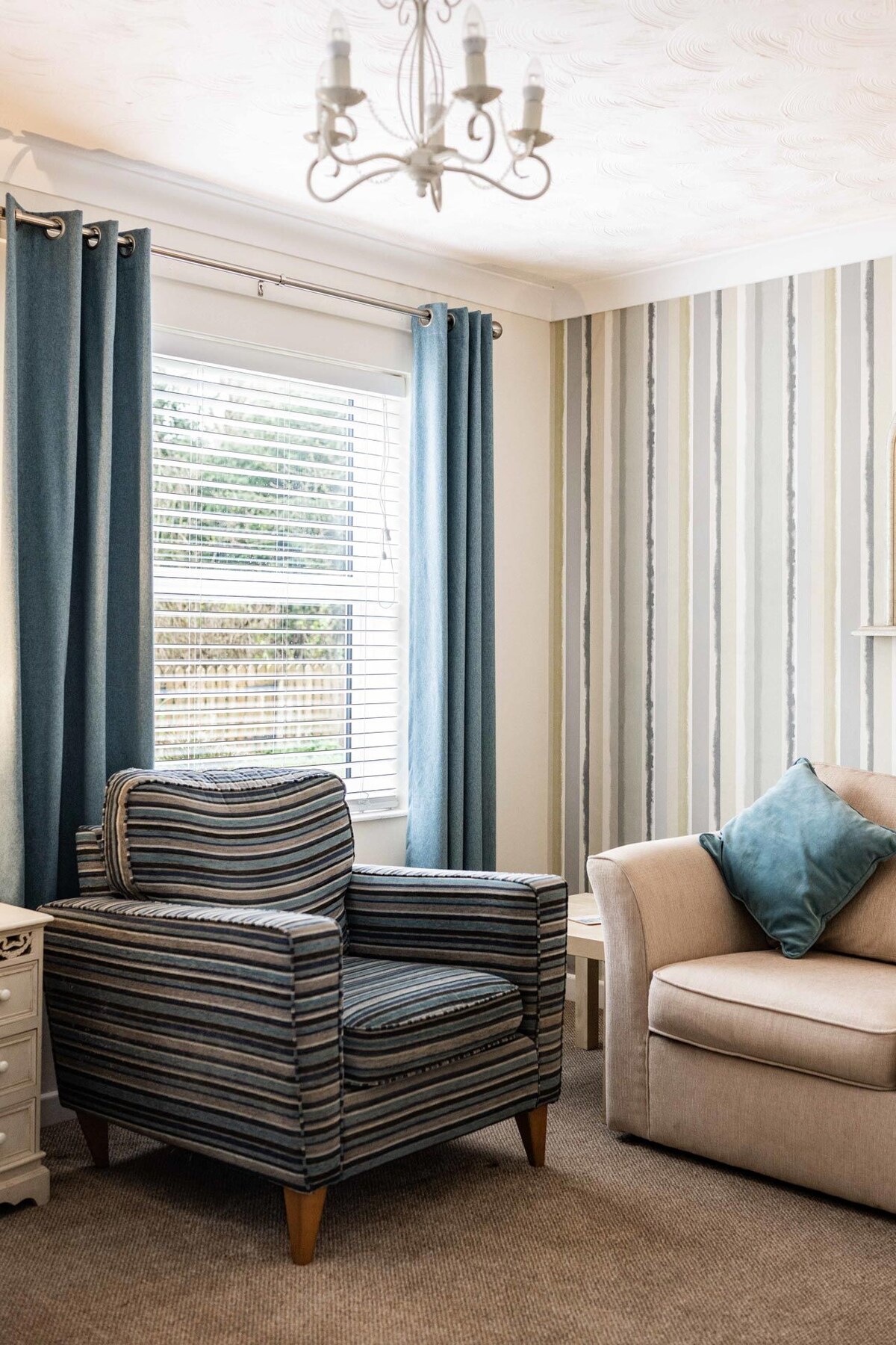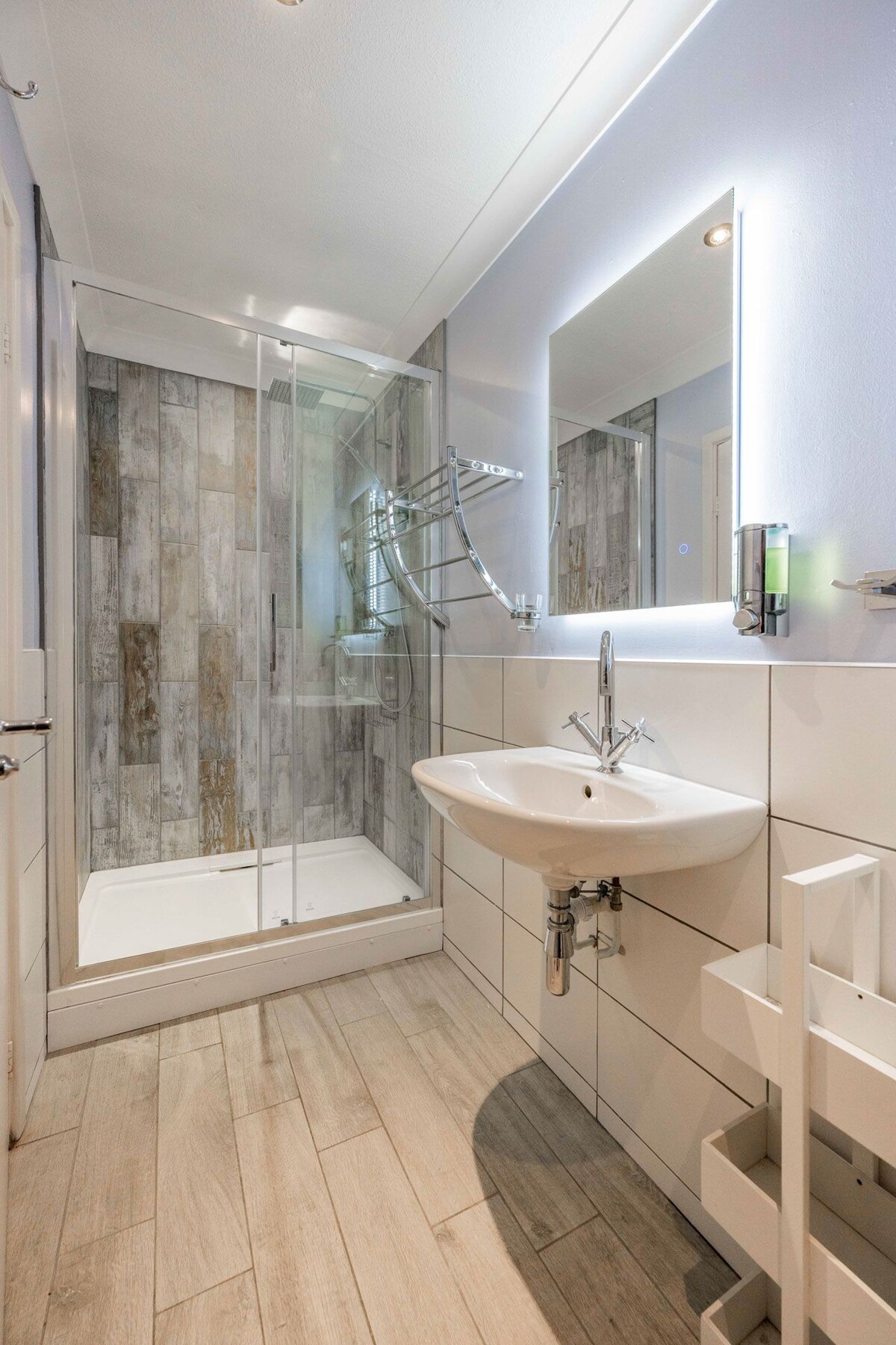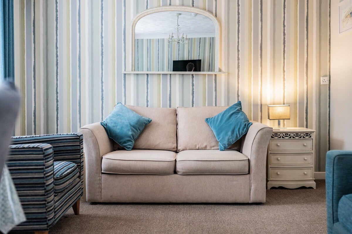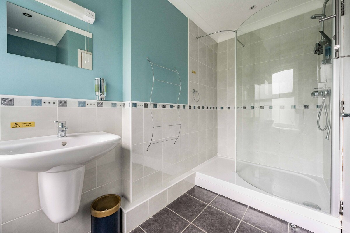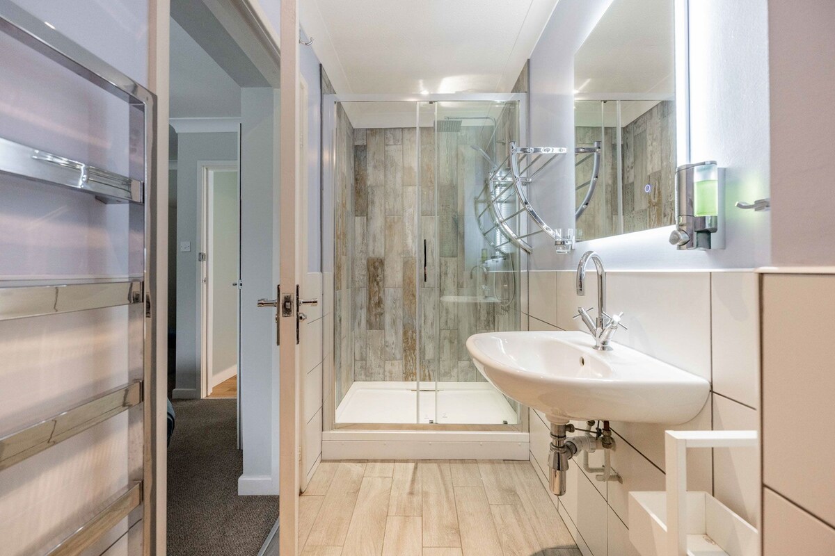 The large bedroom has a dressing table, flat-screen TV, and an ensuite with a shower and W/C. A second bathroom with a shower and W/C is located off the sitting room.