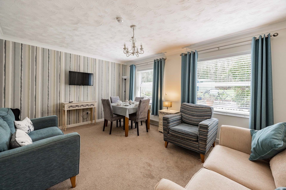 The sitting room offers comfortable sofas, a flat-screen TV, a dining table for four, and a sofa bed that can accommodate two additional guests.