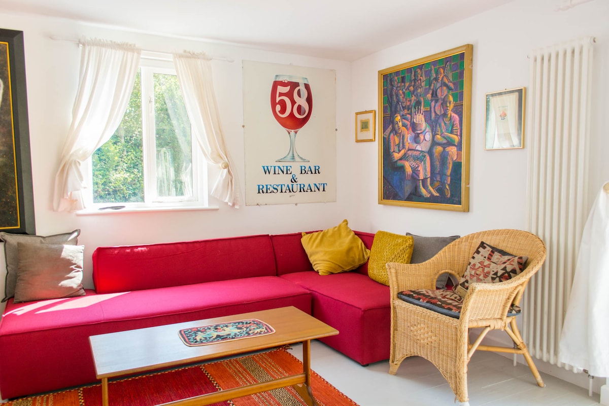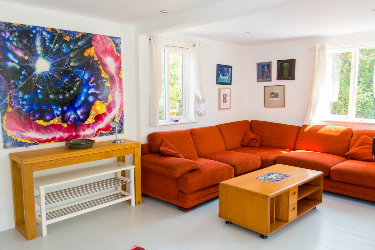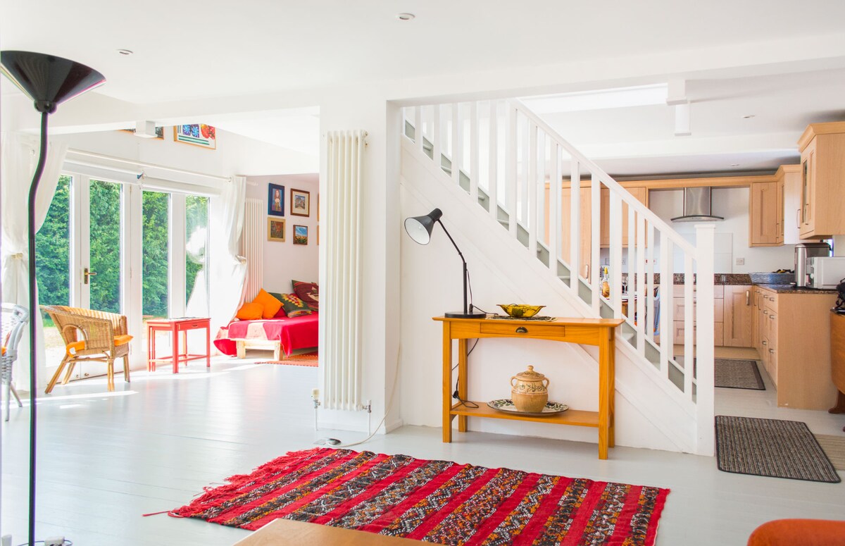Hen Barn features a spacious open-plan living area with a lounge, kitchen, and dining table for all guests. A wooden staircase leads to a mezzanine floor with balustrades overlooking the main space. The ground floor has multiple seating areas and a flat-screen TV, while the fully equipped kitchen includes all necessary appliances and utensils.Beautifully renovated and decorated with colorful art by the owner and local artists, the home offers 2 double bedrooms and 1 twin room with an en-suite shower. A family bathroom upstairs can also serve as an en-suite for the first double bedroom.
