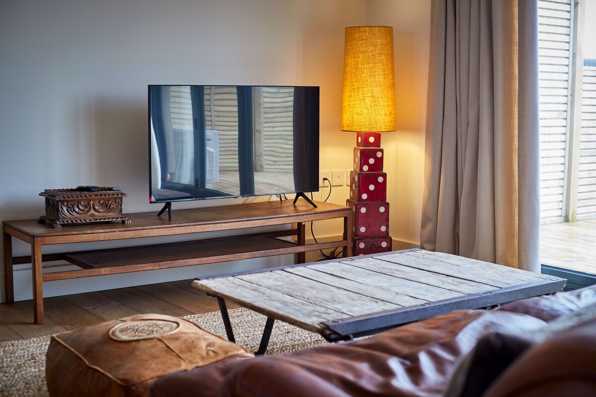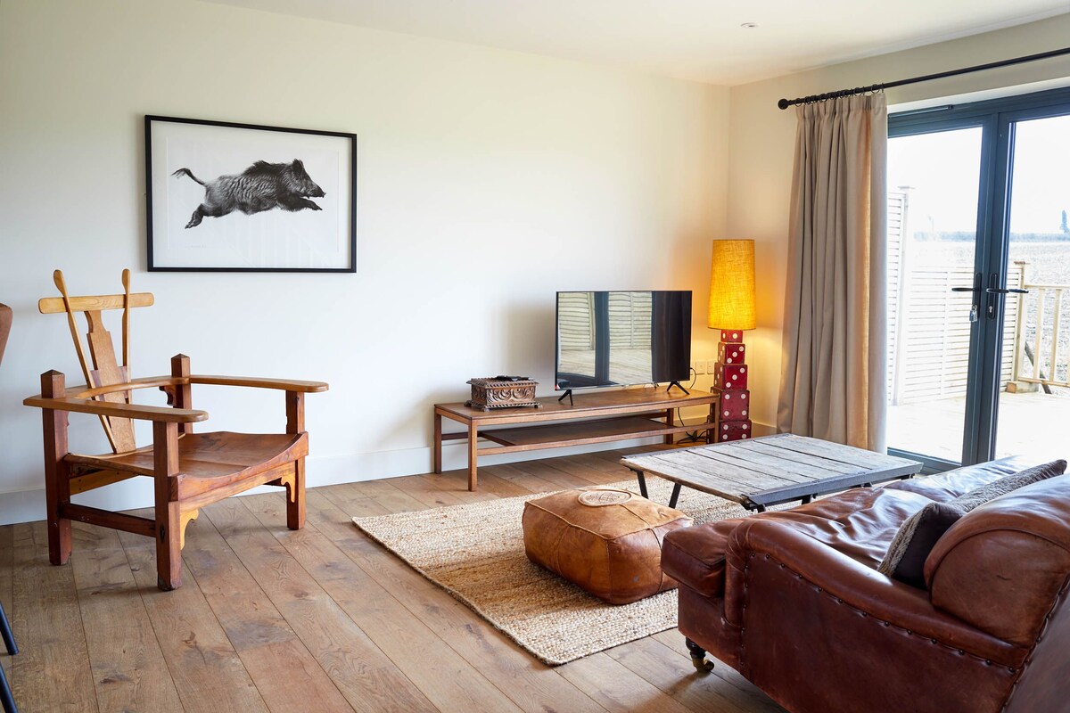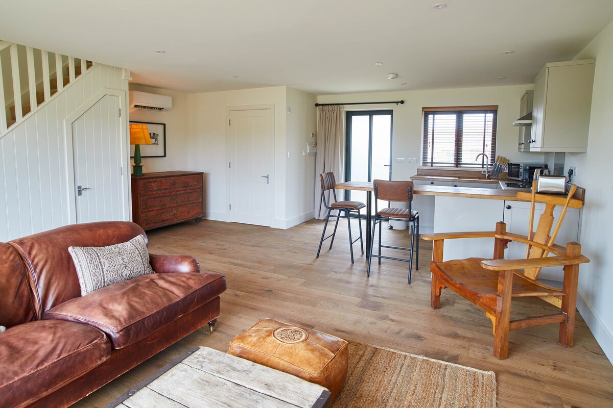 The open-plan living area is an inviting space for couples to relax. Stretch out on the spacious sofa, catch up on your favourite shows with the TV, or stay connected with Wi-Fi, making it easy to unwind after a day of exploring the beautiful Norfolk area.
