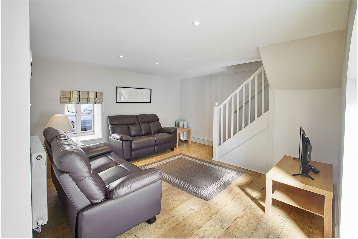 Mill has a welcoming and homely living area. With large frosted windows either side of the entrance door, light floods into the ground floor space to create a bright and airy feel.The spacious living area includes two leather sofas and a flat screen TV so it’s perfect for relaxing.