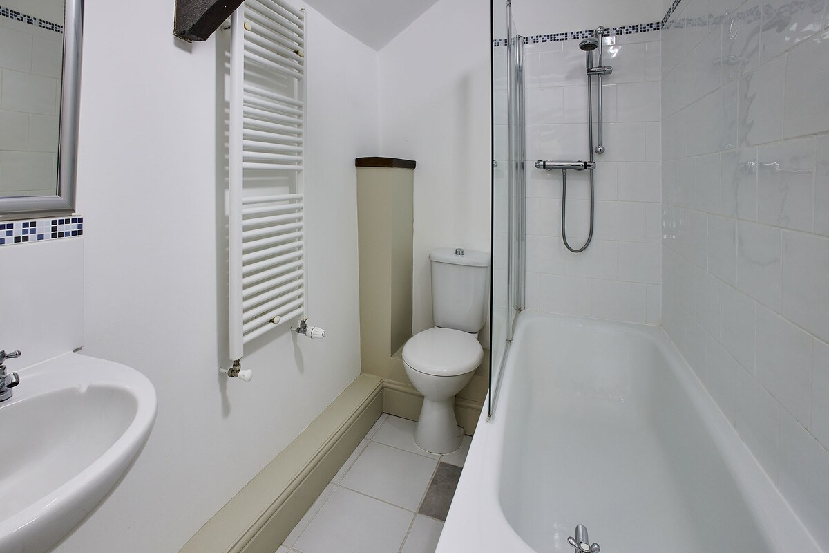 The bathroom has a bathtub with an overhead shower, WC and wash basin.