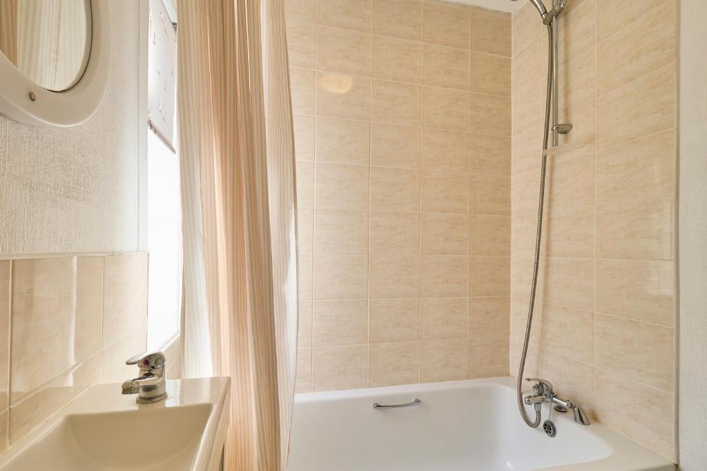 The bathroom is modern and stylish. It features a bathtub with overhead shower and a bright, contemporary feel.