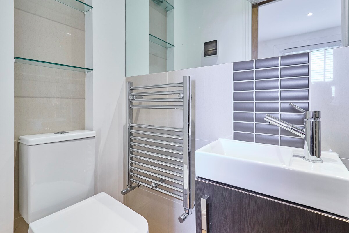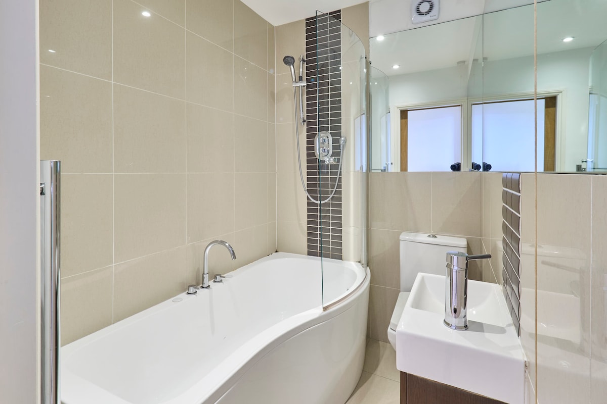 Head to the family bathroom and you’ll find a bathtub with overhead shower, WC and wash basin. Featuring shiny tiles and immaculate fittings, this space is modern and stylish.