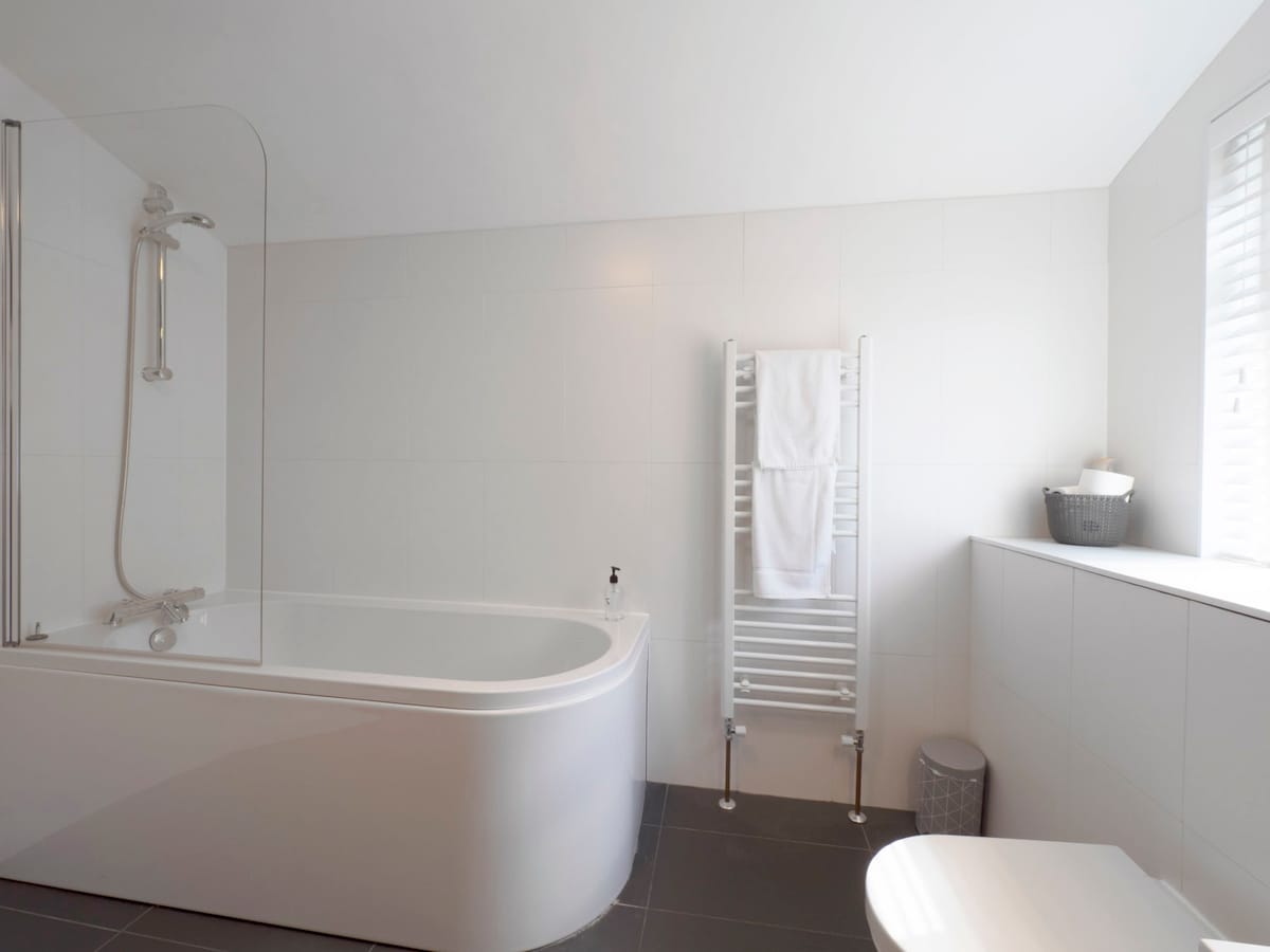 Spacious and modern, the family bathroom includes a large bathtub with an overhead shower, WC and basin.