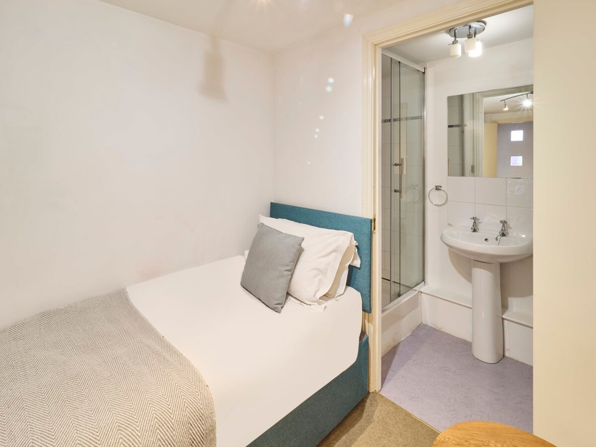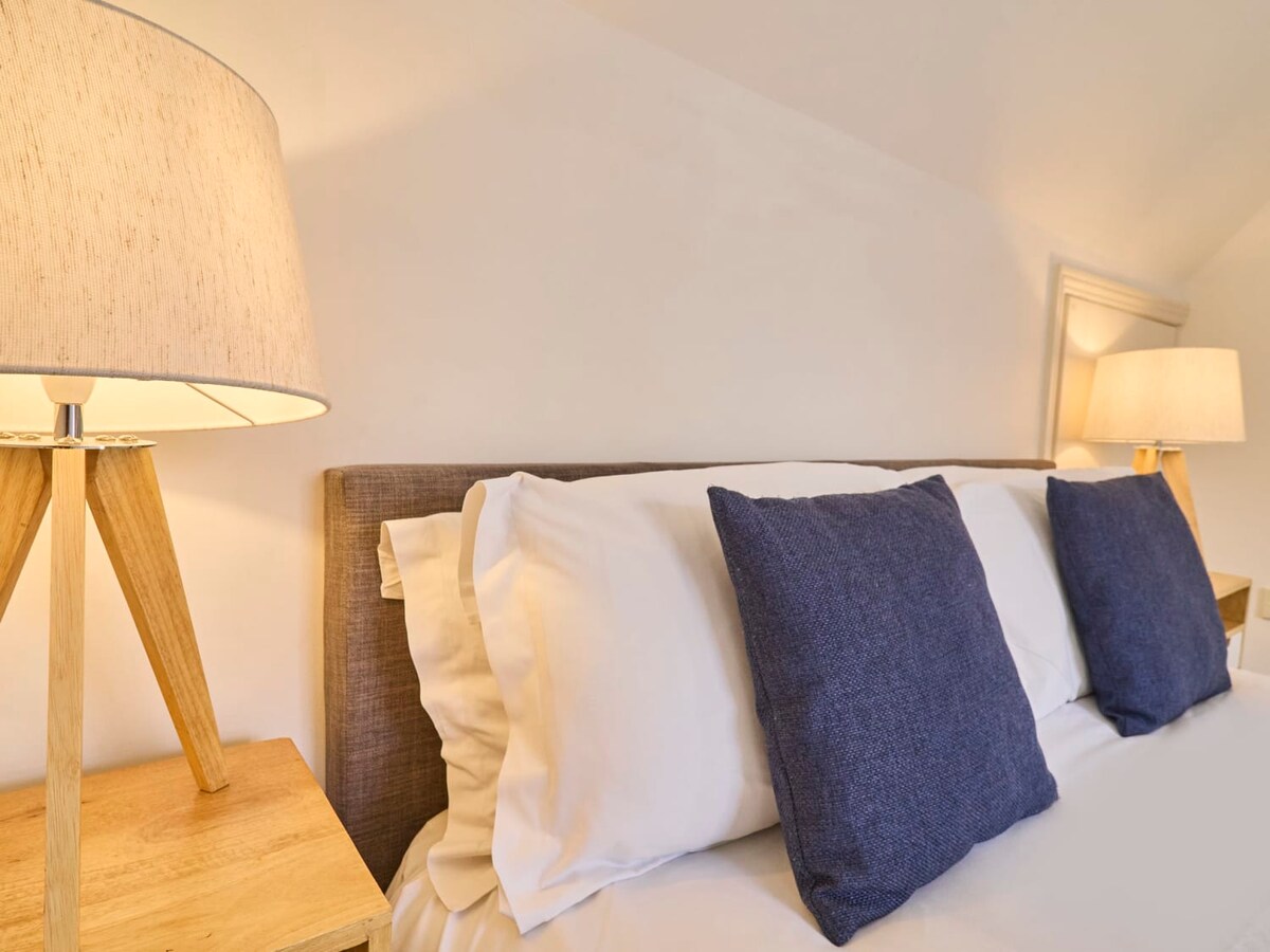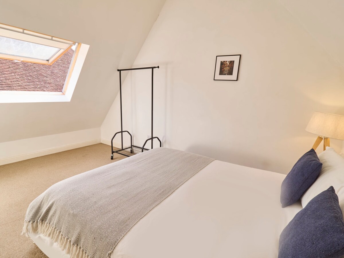 Head upstairs again to the second floor and you’ll reach the master bedroom and a second shower room. With a sloped ceiling and a neutral colour scheme, the bedroom is cosy and relaxing. You’ll enjoy your sleep in the comfy double bed which has soft linens and plush bedding.
