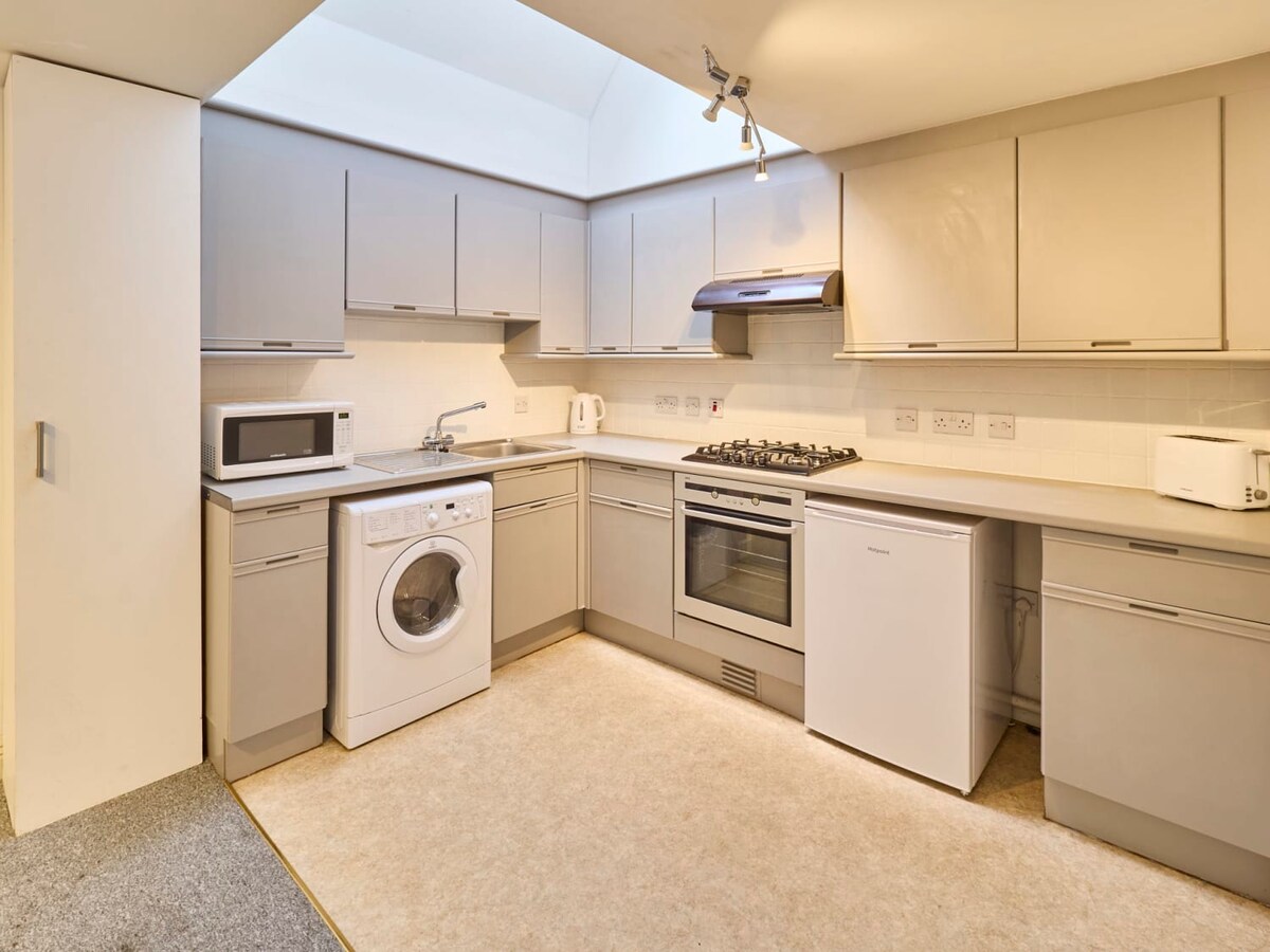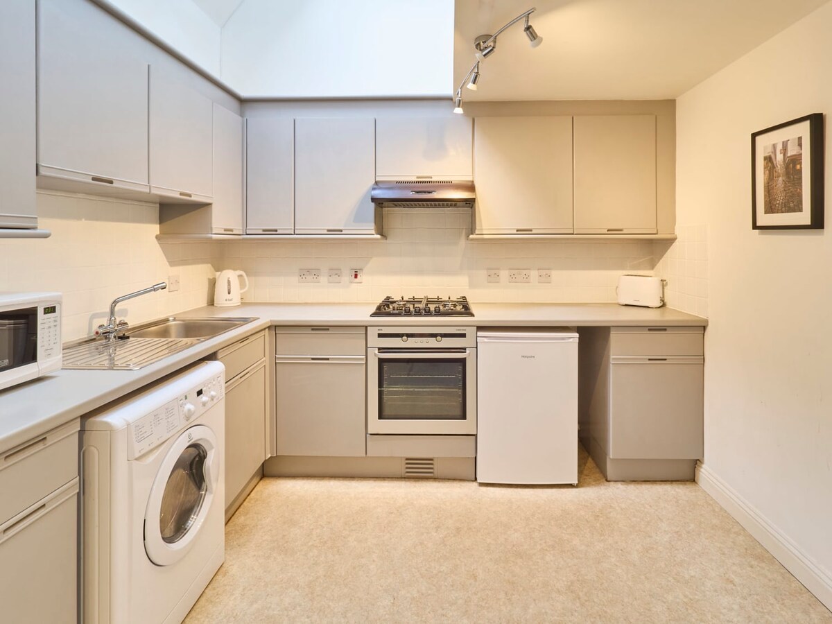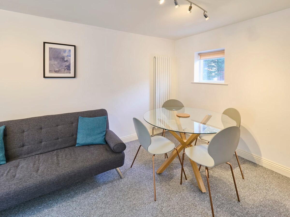 Take the stairs up to the first floor and you’ll find the open plan kitchen, living and dining room. Fully equipped for self-catering stays, the kitchen includes an oven, hob, microwave, toaster, kettle, fridge and washing machine. All cookware is provided so you can prepare and enjoy home cooked meals during your stay. The dining area features a round table and four modern chairs.