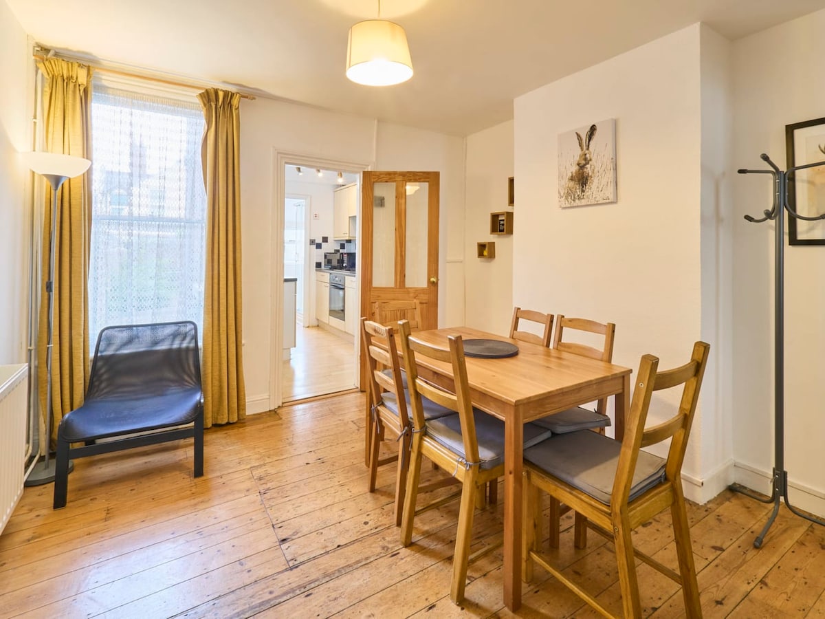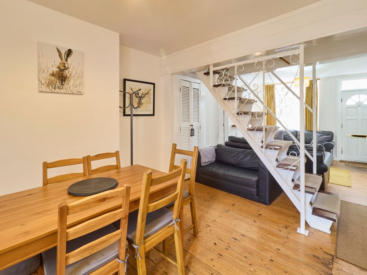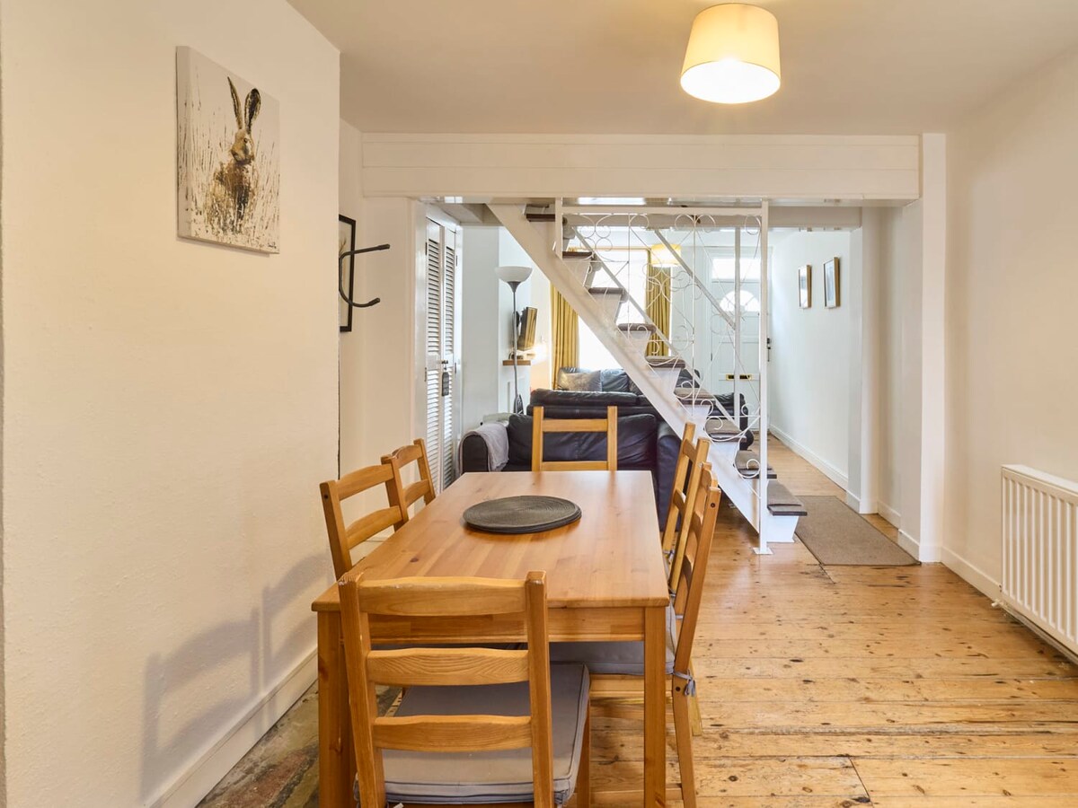 Continue past the staircase and you’ll reach the dining area which includes a wooden dining table and six matching chairs. There is a quiet and brightly lit reading corner where you can get lost in a good book during your stay.