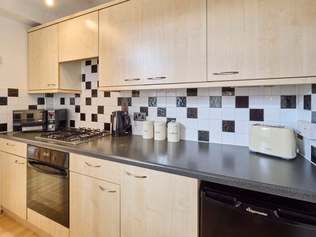 The fully equipped kitchen is located at the rear of the cottage. Traditional in style, it features wooden cabinets and monochrome tiles. You’ll be able to prepare home cooked meals easily as the kitchen includes an oven, hob, microwave, kettle, toaster, coffee machine and fridge. There is also a washing machine perfect for longer stays!