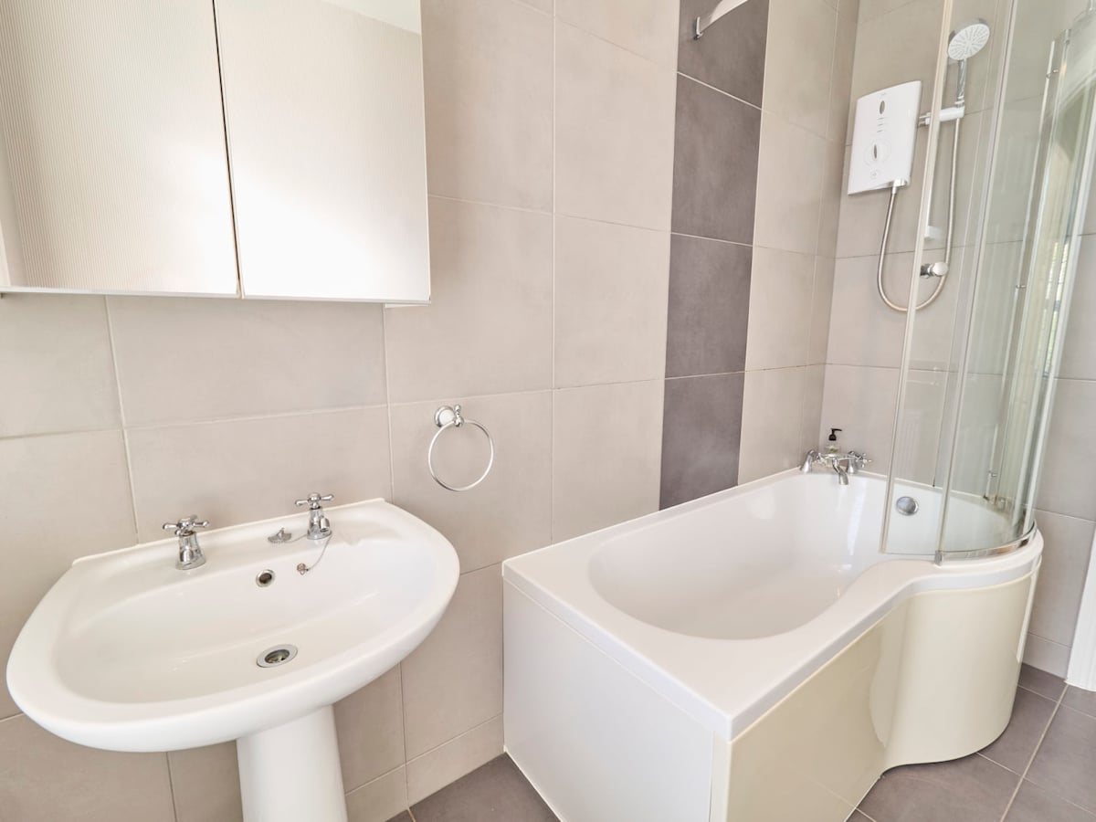 You will find the family bathroom right next to the second bedroom, showcasing a modern design with a WC, basin and a bathtub with an overhead shower.