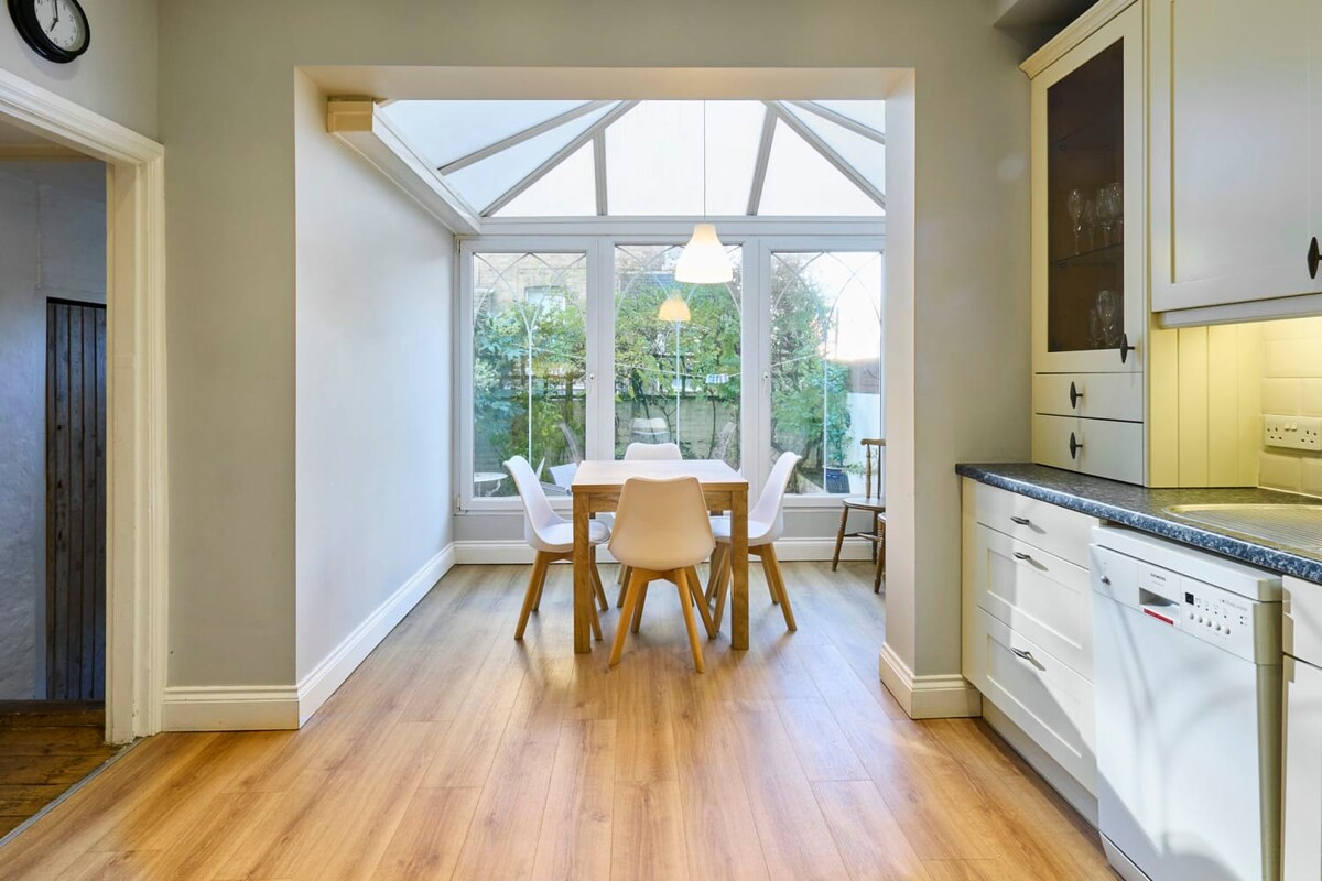 Continue onwards to the rear of the house and you’ll reach the open plan kitchen and dining area which is a light and airy space. Traditional in design, the kitchen has light, wooden cabinets and cream tiles. Fully equipped for self-catering stays, there is an oven, hob, fridge freezer, washing machine, dryer, dishwasher, toaster and kettle. The dining area has a wooden dining table and a bright environment.