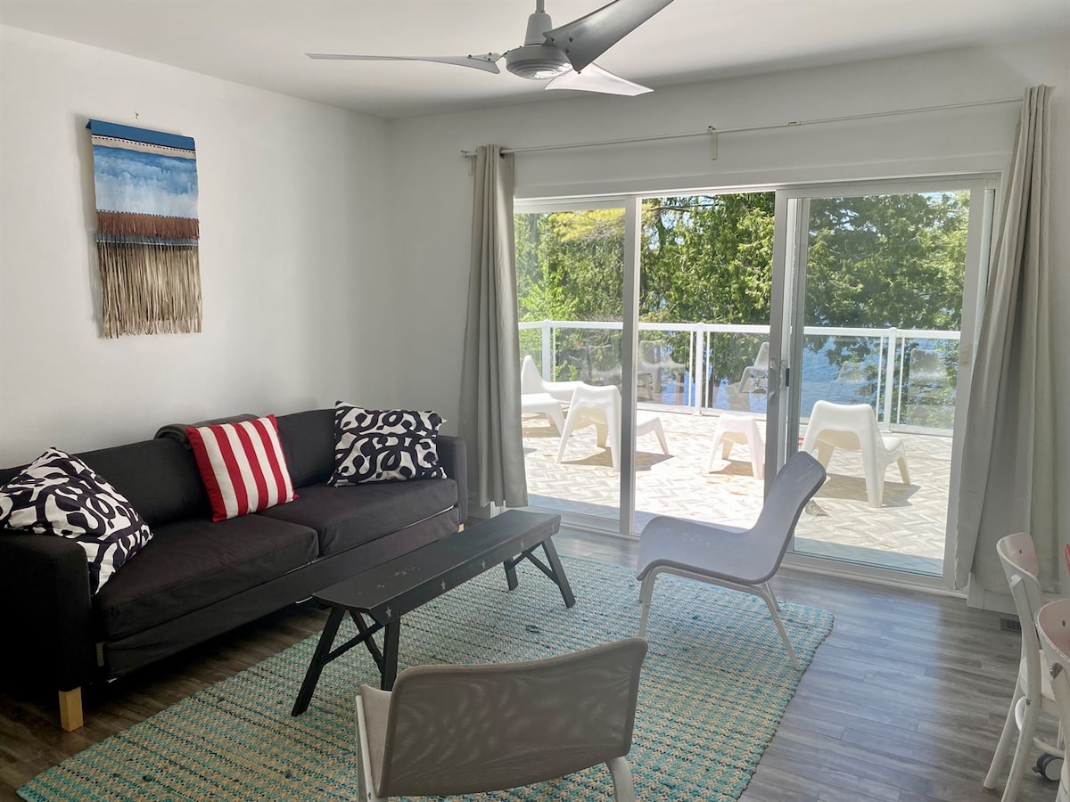 Just renovated gorgeous 4 bedroom 2 bath cottage, 25 feet of glass fronts the lake, large private area in front of cottage, 3 bedrooms have private verandas, 3 bedrooms have king size beds that separate into 2 extra long twins, new modern kitchen with large refrigerator and dishwasher, full size washer/dryer in unit. Fish cleaning hut. This is a fisherman's paradise but nice enough to bring the family. The swimming is incredible. There is a kayak, canoe and paddleboat for your use and you can rent a little fishing boat from us, a pontoon boat or a speedboat. If you need more space, you can rent one of the other cottages next door. The lake is feet away and we have a sandy beach and a boat launch.