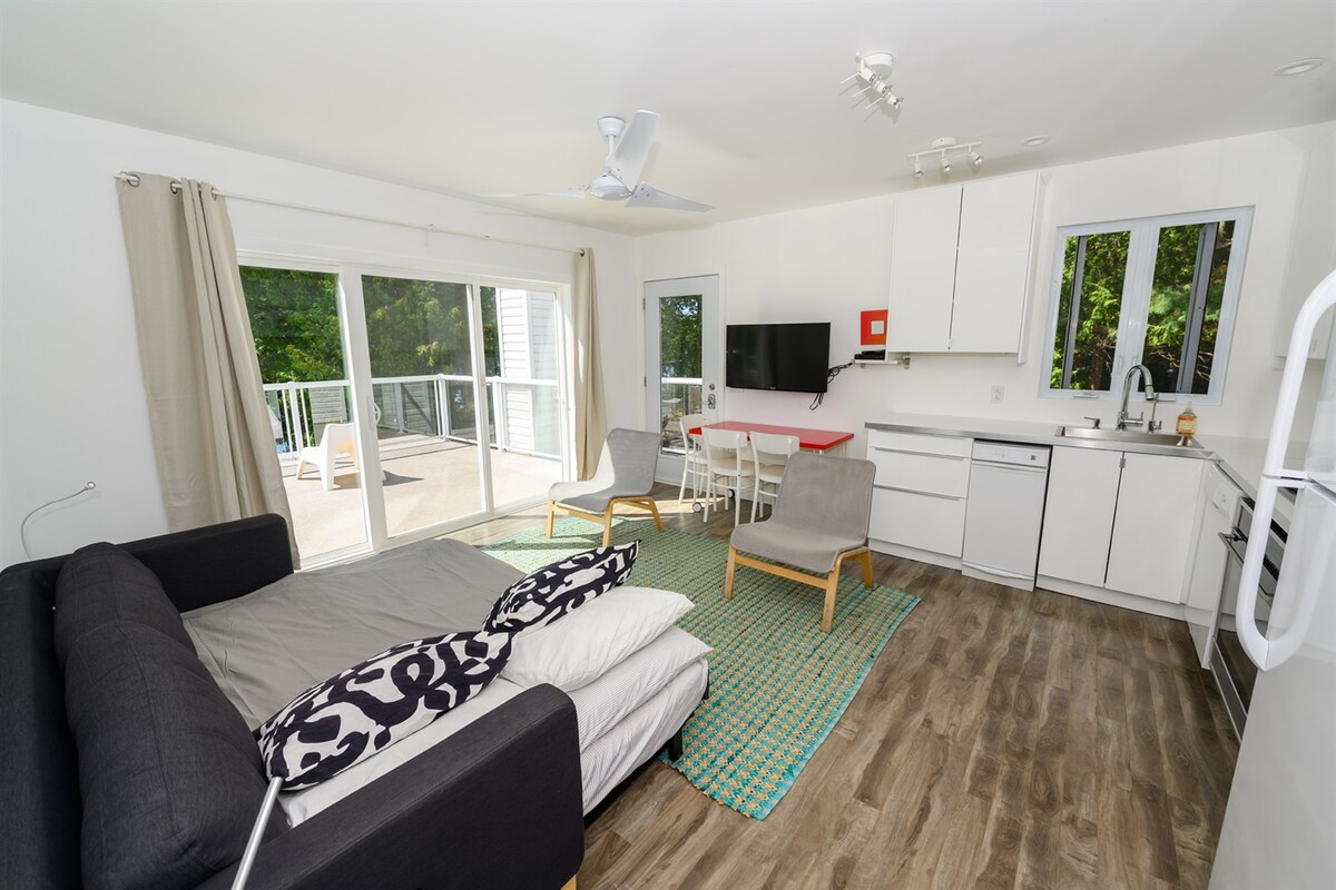 There is a deck and another kitchen and living room on the second floor. The main living room has both a wood-burning and a modern Malm gas fireplace.