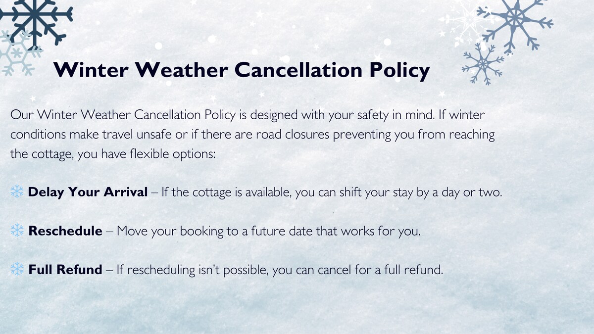 Our Winter Weather Cancellation Policy is designed with your safety in mind. If winter conditions make travel unsafe or if there are road closures preventing you from reaching the cottage, you have flexible options: