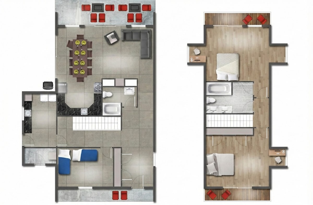 The first bedroom is a kid’s dream, offering a double-over-double bunk bed and a twin bed.