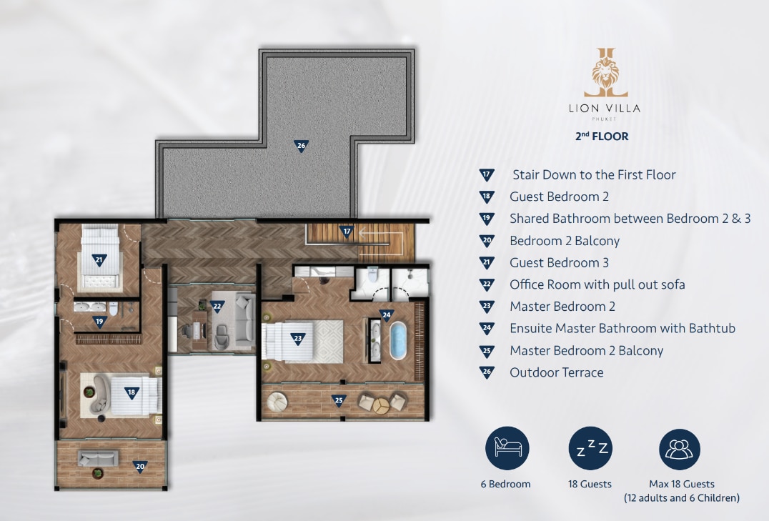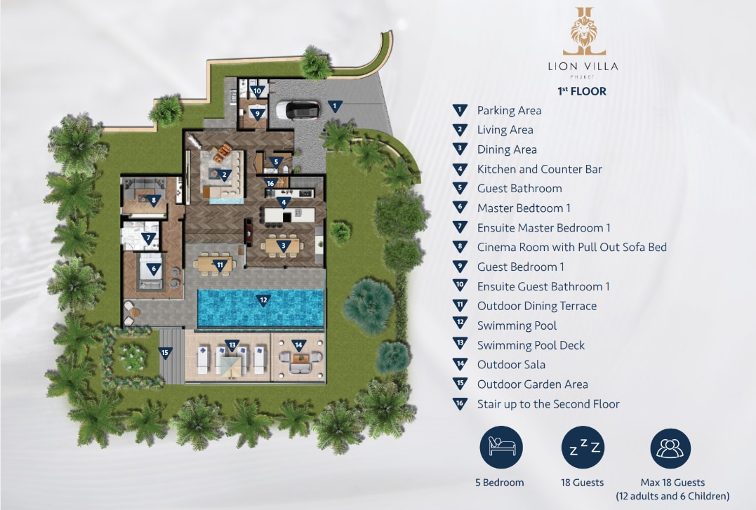 Experience the ultimate in tropical luxury at Villa Lion, a newly renovated 5+1 bedroom villa that sleeps up to 12 adults and 6 children. Nestled within the exclusive Pavilions Phuket Resort, this villa offers the perfect blend of privacy, comfort, and five-star service — ideal for families or groups seeking a relaxing getaway.