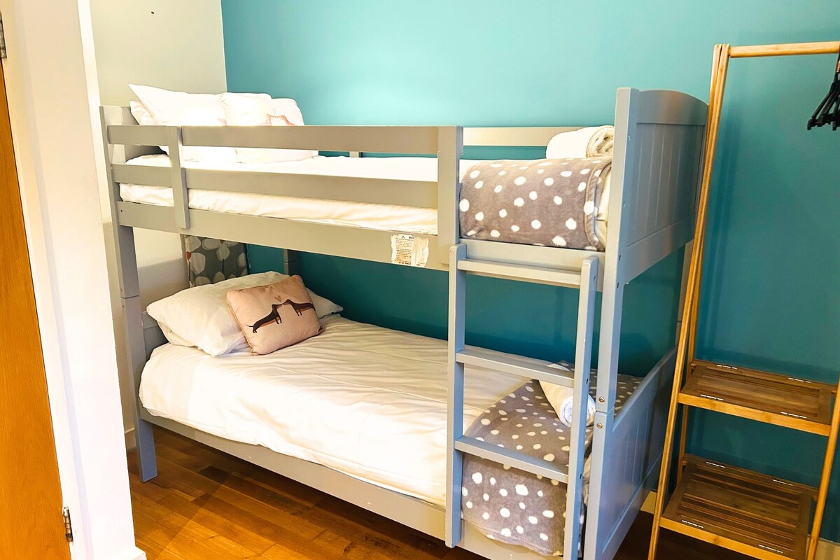 The first bedroom contains two single beds plus a bunk bed, wardrobe and chest of drawers.