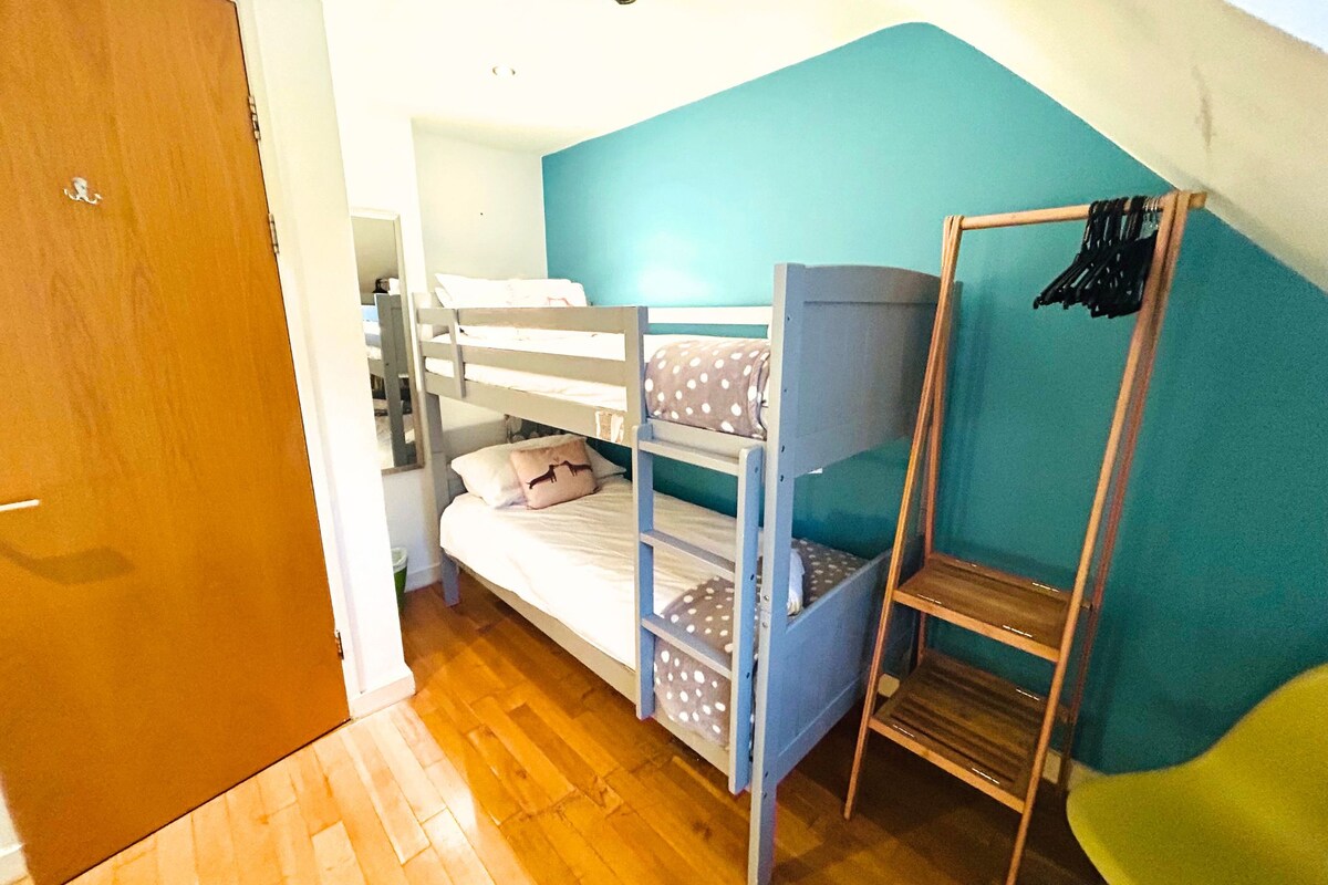 On the first floor you land in the open plan living room, kitchen diner, with large period windows to let the sunshine stream in. This room contains coffee table and flat screen wall mounted 42'' TV. Guests can enjoy high speed WiFi and a fully-equipped kitchen where you really can treat as a home away from home. Also on this floor you will find the family bathroom with fresh towels for each guest.