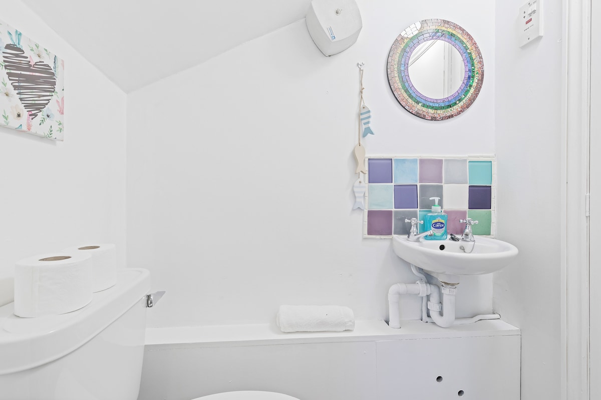 Close to the sea front and the high street. It's an ideal set up for 6 guests. The car park helped us park our vehicle. The kitchen and bathroom were well stocked. Had a chat with the neighbors and they seemed friendly as well.