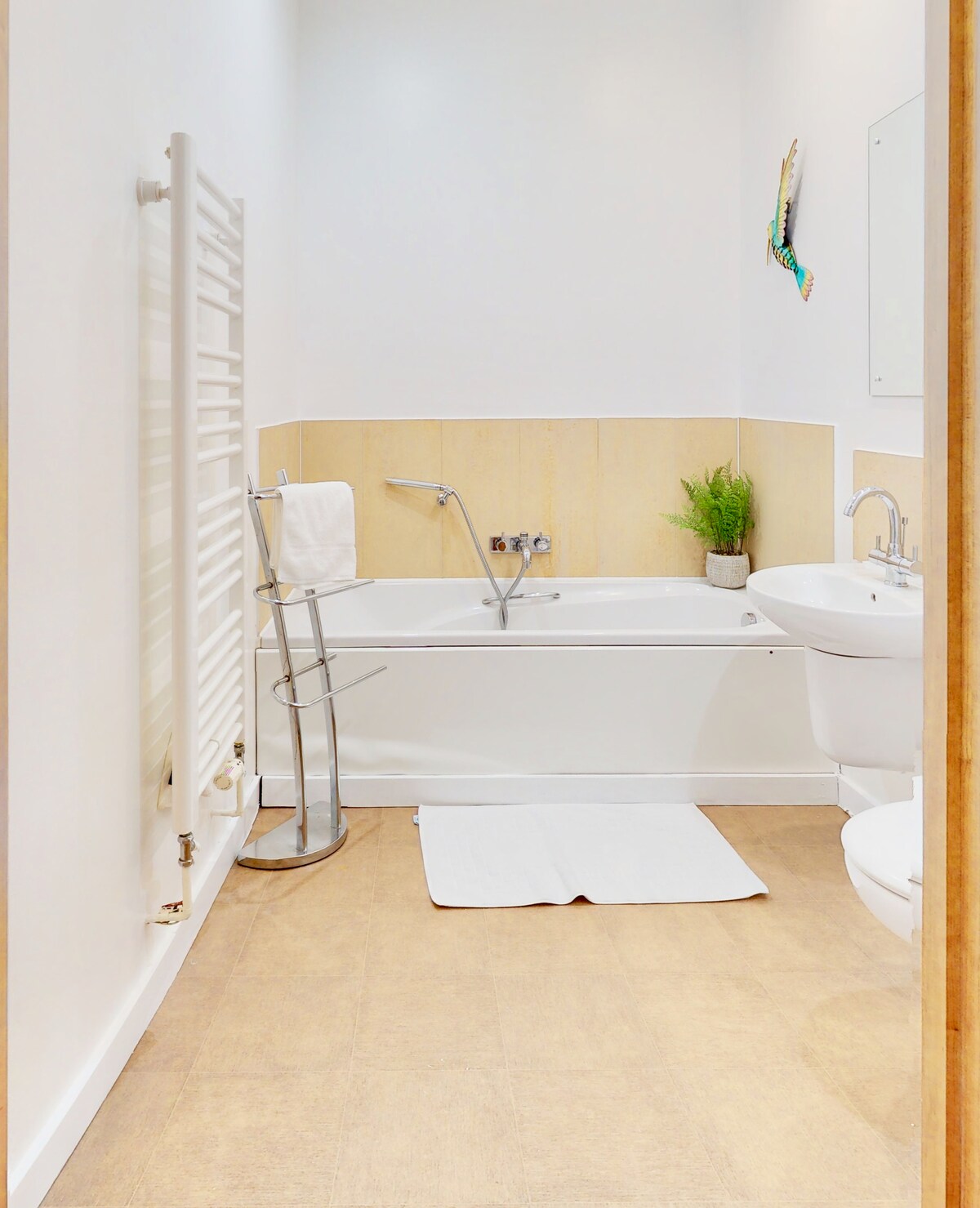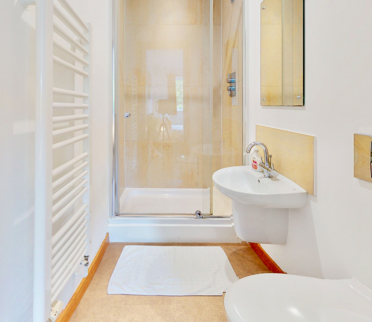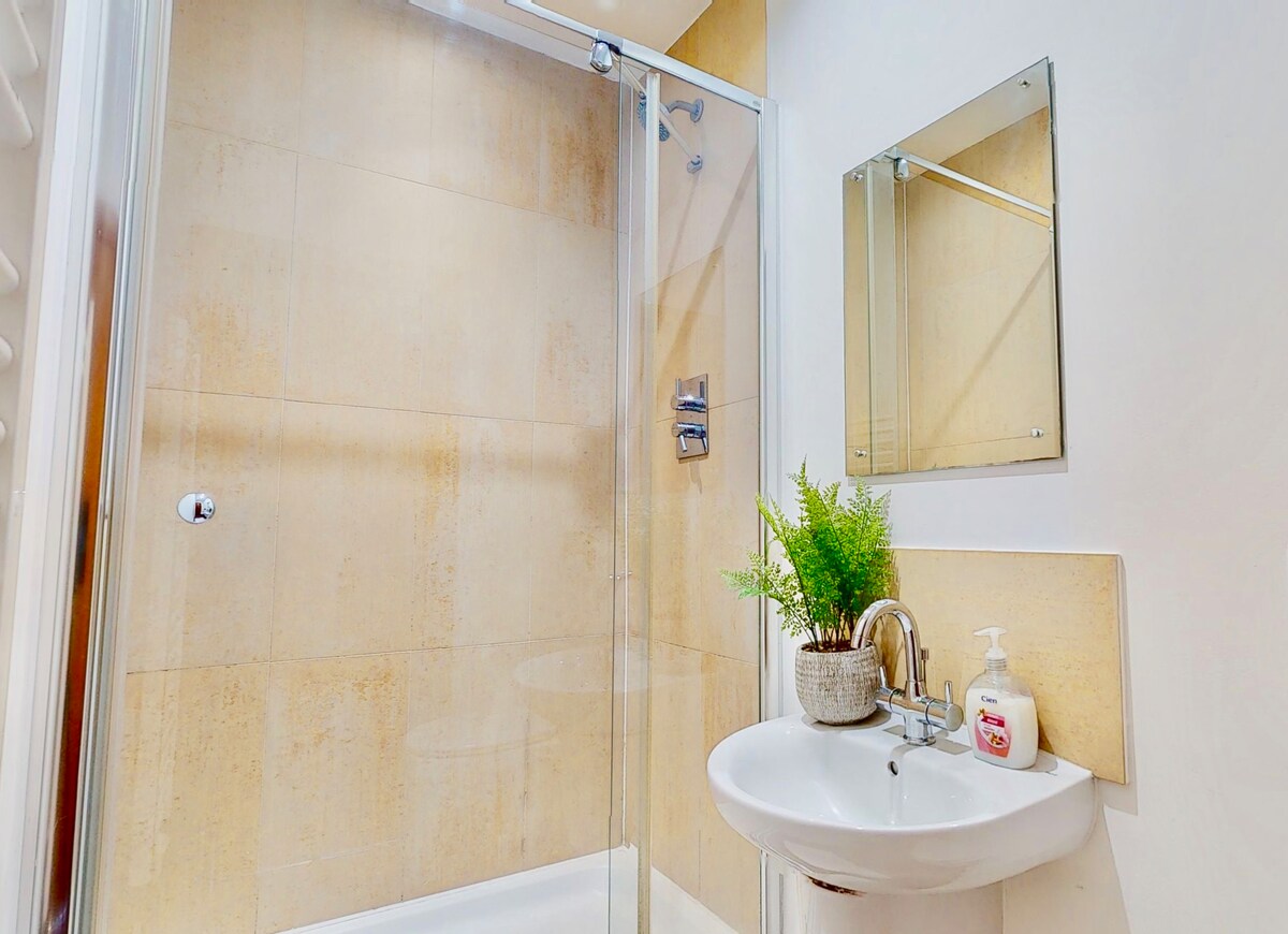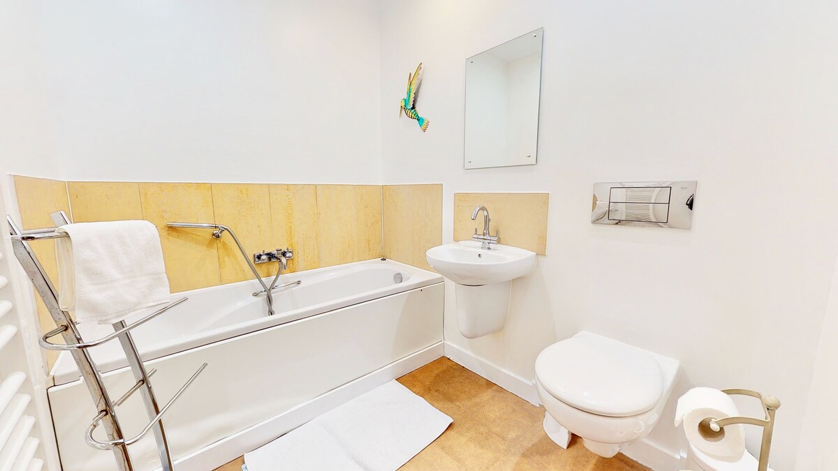 This spacious bathroom has a W/C, bath with shower attachment and is equipped with the quality soaps, towels that you would expect. The flat also includes a complete range of cleaning and laundry items including iron, clothes drying rack, hoover and cleaning items etc.