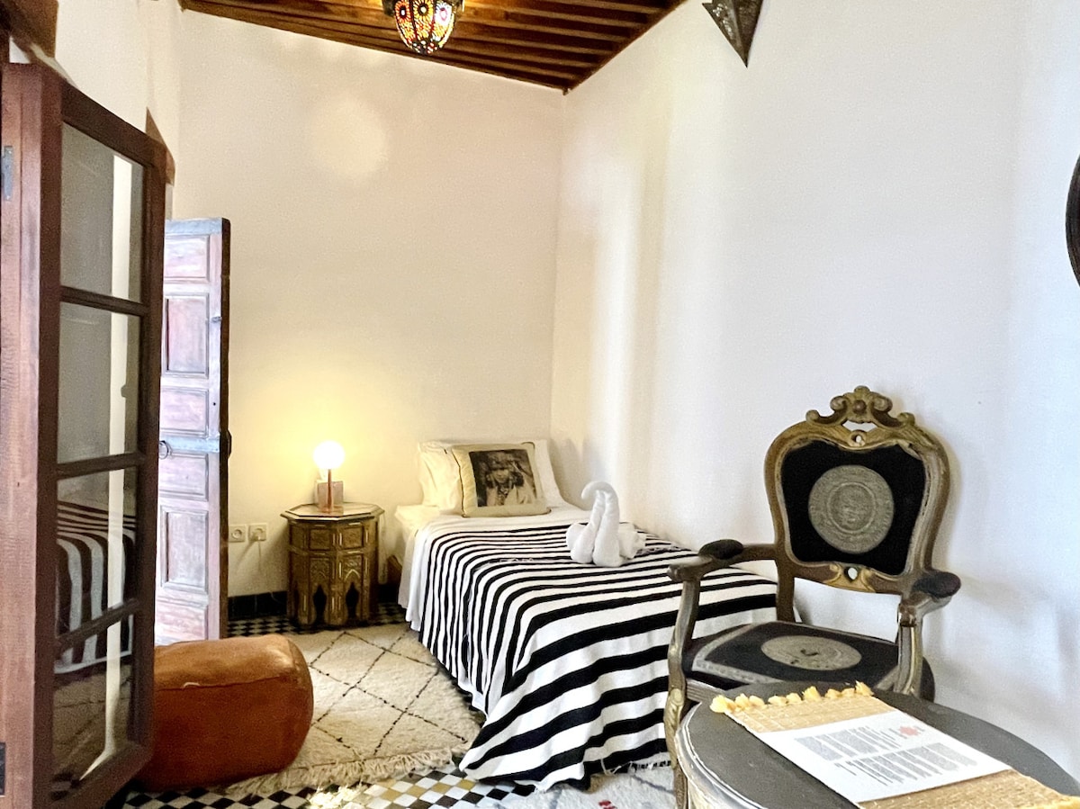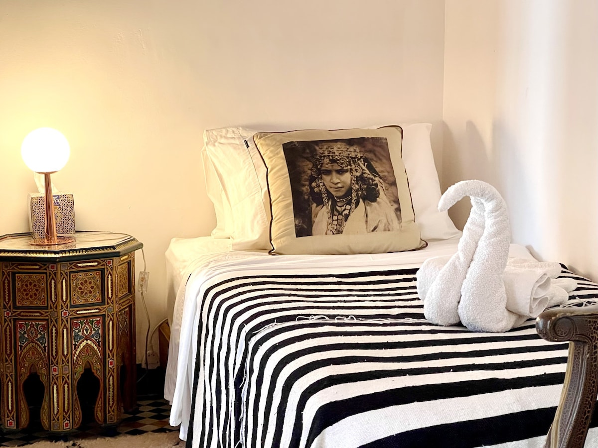 🛏 Baraka Room (Second Floor) – Two 90 x 200 cm single beds with a bathroom just outside, including a generous bath with an overhead shower. This room opens onto a small balcony with a table and chairs.
