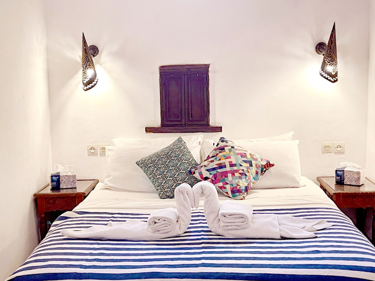 🛏 Amazigh Suite (Second Floor) – Features a 160 x 200 cm double bed, ensuite shower room, and a lounge area with a sofa that converts to a single bed.