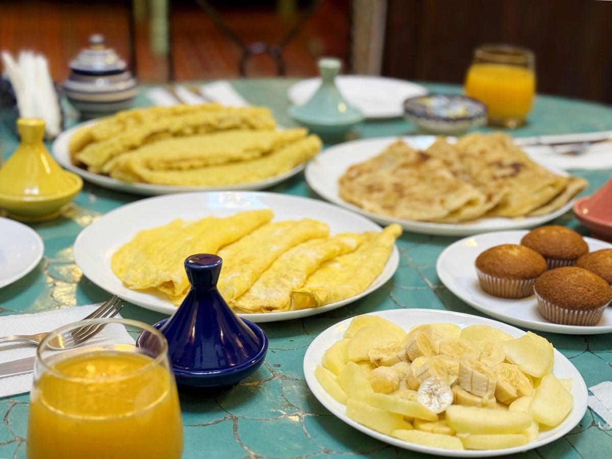 ✔ Optional Moroccan Breakfast (€8 per person) – Enjoy a delicious spread of Moroccan bread, honey, jam, cheese, eggs made to order, yoghurt, fresh fruit, and juice.