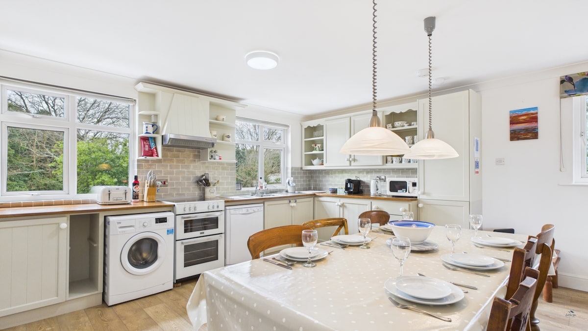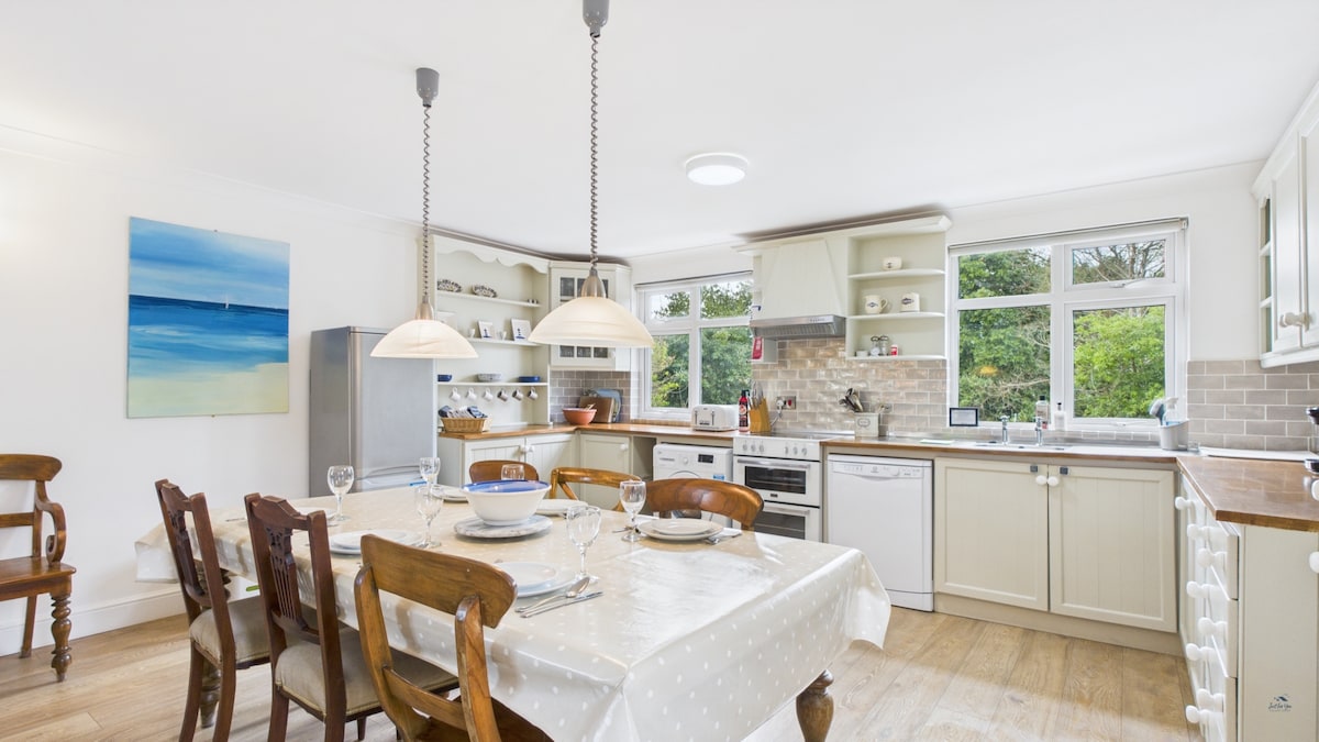 At the front of the property, the lawned garden is a bright and sunny space with outdoor dining set for 4, perfect for relaxing after a long day of fresh sea air. Situated to the left of the house is a secluded driveway with parking for up to two cars, plus an Ev car charger.