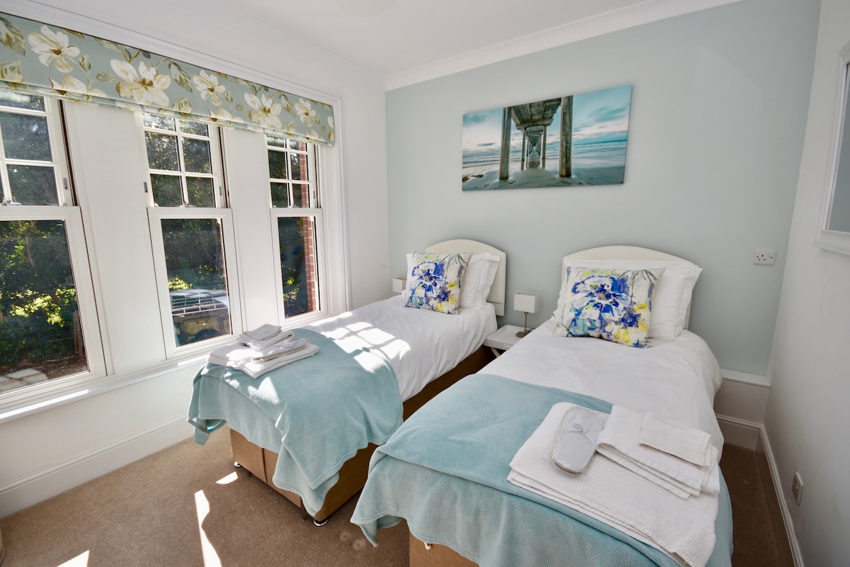 This coastal apartment has two bedrooms, both with zip-link king double beds, which can be turned into twin beds on request. Both are beautifully decorated, offering a comfortable place to rest after a day of exploring the local area or Bembridge or adventuring across the Isle of Wight. The master bedroom offers a large en-suite bathroom with a shower. Along the hallway is a large family bathroom with an L-shaped bath with shower over, basin and Wc.