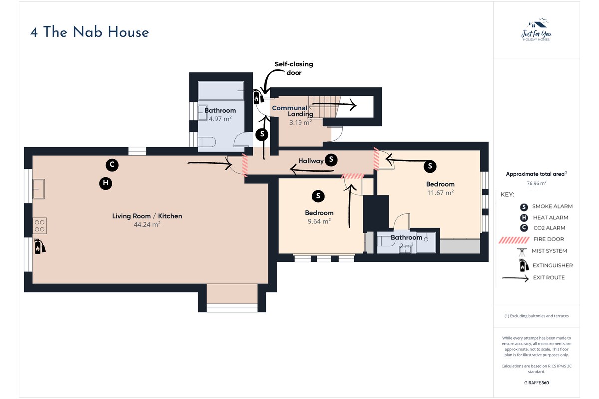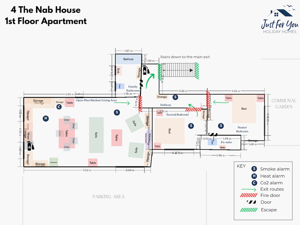 Follow the first-floor stairs to step inside The Nab House - No.4, and be welcomed into a spacious open-plan living/kitchen room. A relaxing space with comfortable plush sofas, snug armchairs and a large Smart Freeview Tv, set next to a dining space for 6. There’s ample space for families and friends to entertain and enjoy a meal together, prepared in the fully fitted kitchen, with all modern amenities including oven/hob, large fridge/freezer, microwave, dishwasher and a Nespresso coffee machine.