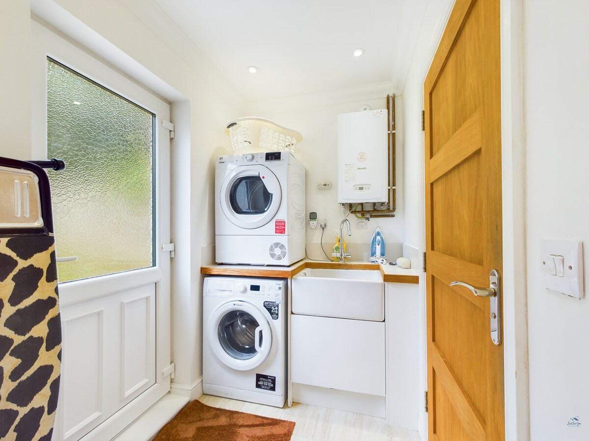 Utility room with back door into the garden, with washing machine, tumble dryer and a sink.