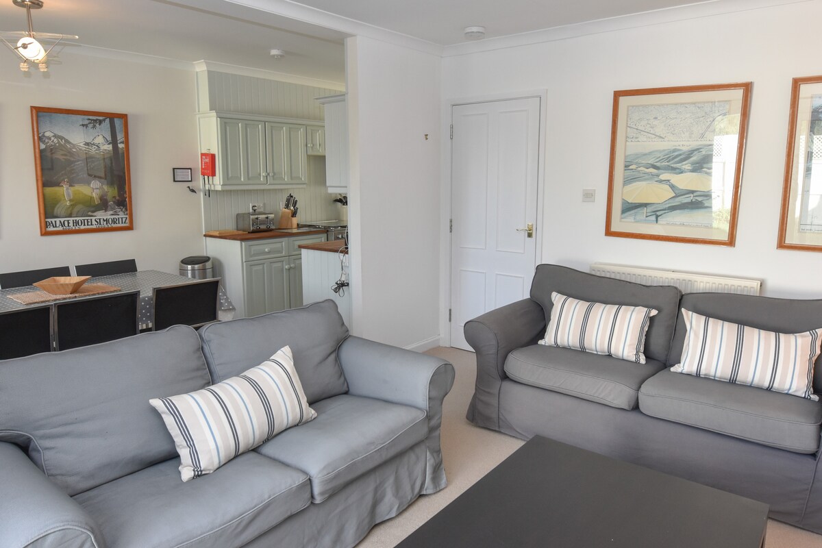 To your left, you’ll find a cosy ground-floor double bedroom and a family shower room, perfect for those seeking easy access. Straight ahead, the open-plan living area invites you to unwind. This spacious social hub features comfortable sofas, a dining table for memorable meals, and a well-equipped fitted kitchen with everything you need for your stay. Patio doors lead out to the private enclosed garden, where a lawn and patio area with outdoor furniture and a Bbq set the scene for alfresco dining and relaxing family gatherings.