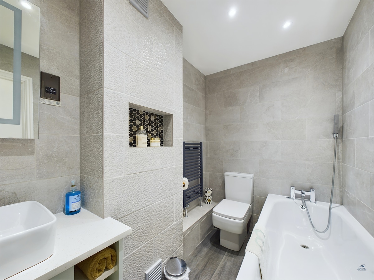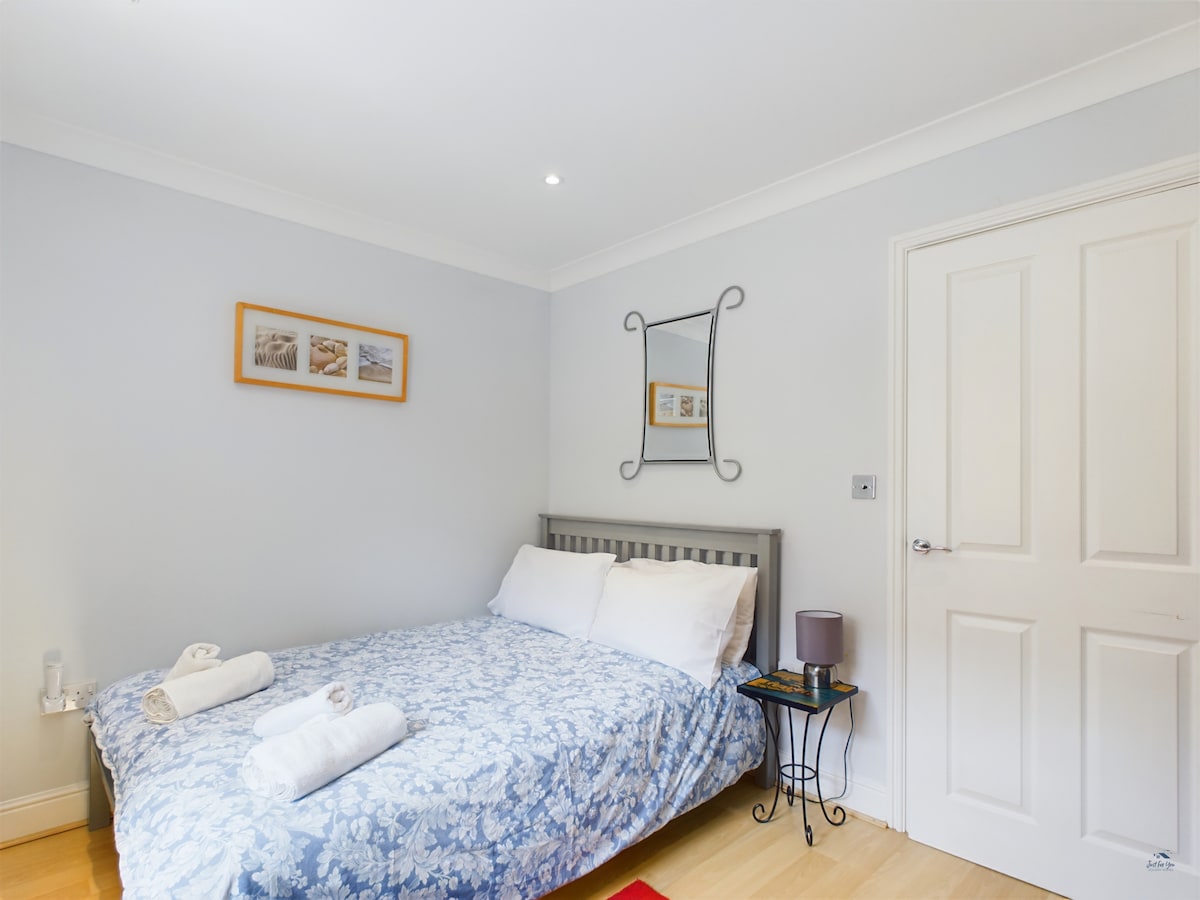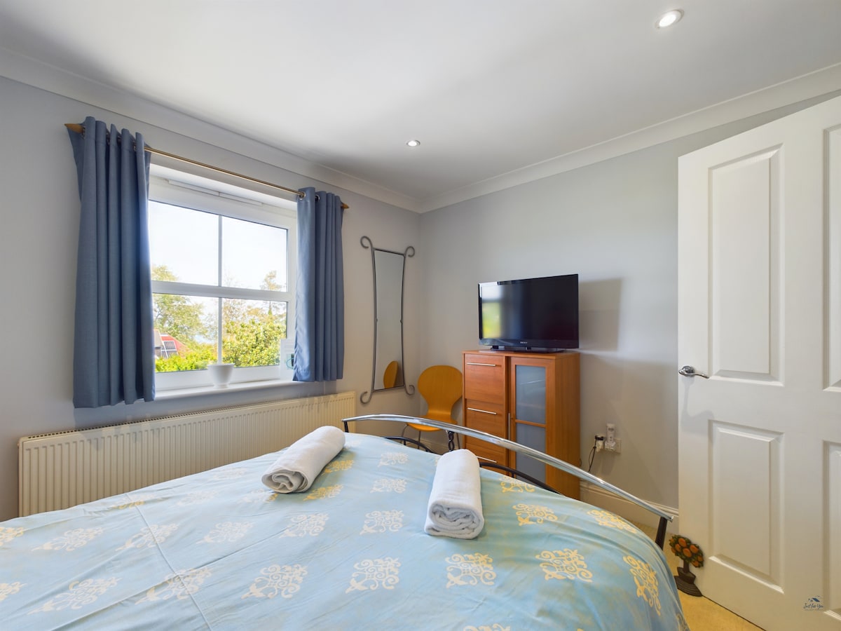 The first floor provides a light-filled living room, offering sanctuary after a day on the beach. Relax on comfortable sofas and watch captivating shows on the Smart Tv, all while soaking in the picturesque views of Bembridge harbour and sea views across the Solent. Retreat to the second floor to find a modern double bedroom with ample storage. The family bathroom also located on the second floor is equipped with a bath, overhead shower, hand basin, heated towel rail and w/c.