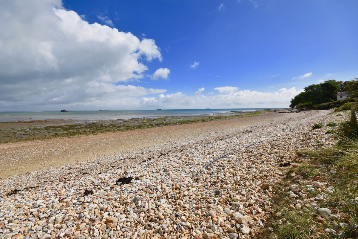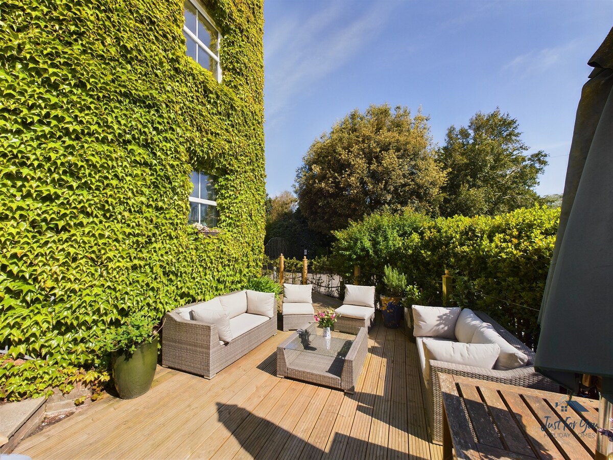 Bask in the sun-soaked decked terrace with comfy seating, perfect for alfresco dining or relaxing into the twilight. The property shares a large communal garden leading directly to Bembridge beach, offering a touch of green and easy beach access.