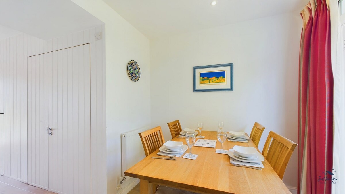The open-plan living area is bathed in natural light, thanks to sliding patio doors leading out to your private front decked terrace. Perfect for letting the fresh Isle of Wight air flow through while you unwind on the plush sofas. Curl up with a good book, gather everyone for movie nights on the large smart Tv, or simply share stories of the day's adventures. The vibrant accents of colour add a touch of personality to the homely furnishings.