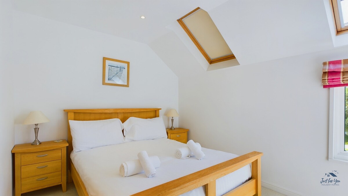 The master bedroom is across the hallway. Offering a double bed with soft wooden furnishings that create a cosy atmosphere, as you settle down after a day of adventure. A large smart Tv provides entertainment options, while ample storage with a chest of drawers and a built-in wardrobe ensures you can unpack and feel right at home.