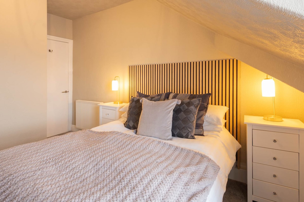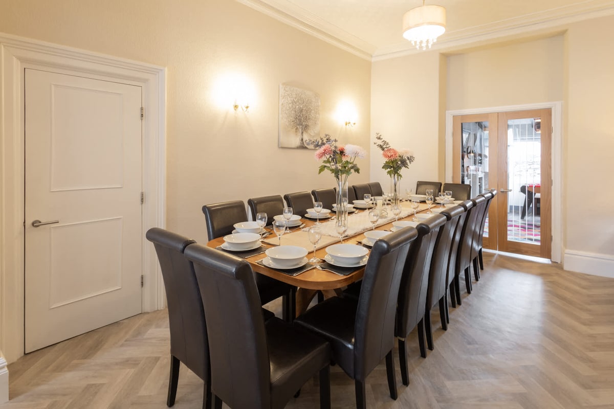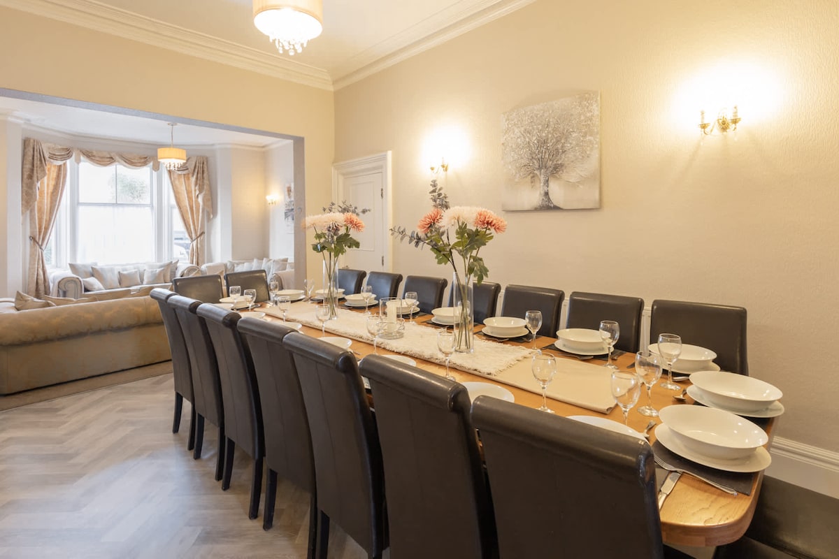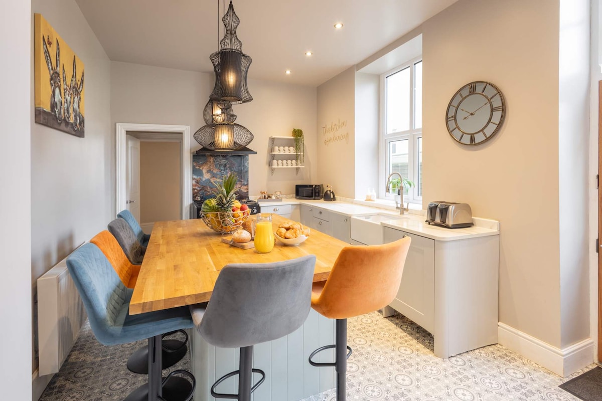 Enter this impressive new home-from-home, which boasts elegant interiors and is set over three floors. On the ground floor, you’ll find a fully equipped kitchen housing all the essentials to whip up a feast to feed your whole group and a dishwasher to help with the clean-up!Down the corridor from the kitchen is a lovely, well-presented living/dining room, a great spot for savouring your dinners together, enjoying family game nights, or even indulging in a movie marathon on the sleek, wall-mounted Smart TV!