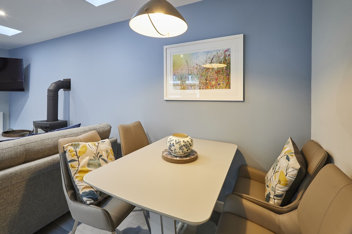The lounge area is tastefully decorated, with soft furnishings in a calming colour palette that creates a warm and welcoming atmosphere. The main focal point of the room is the stunning log burner, which sits centrally within the seating area. To enhance your entertainment experience, a large flat-screen TV is mounted on the wall, offering easy viewing from both the dining and lounge areas.