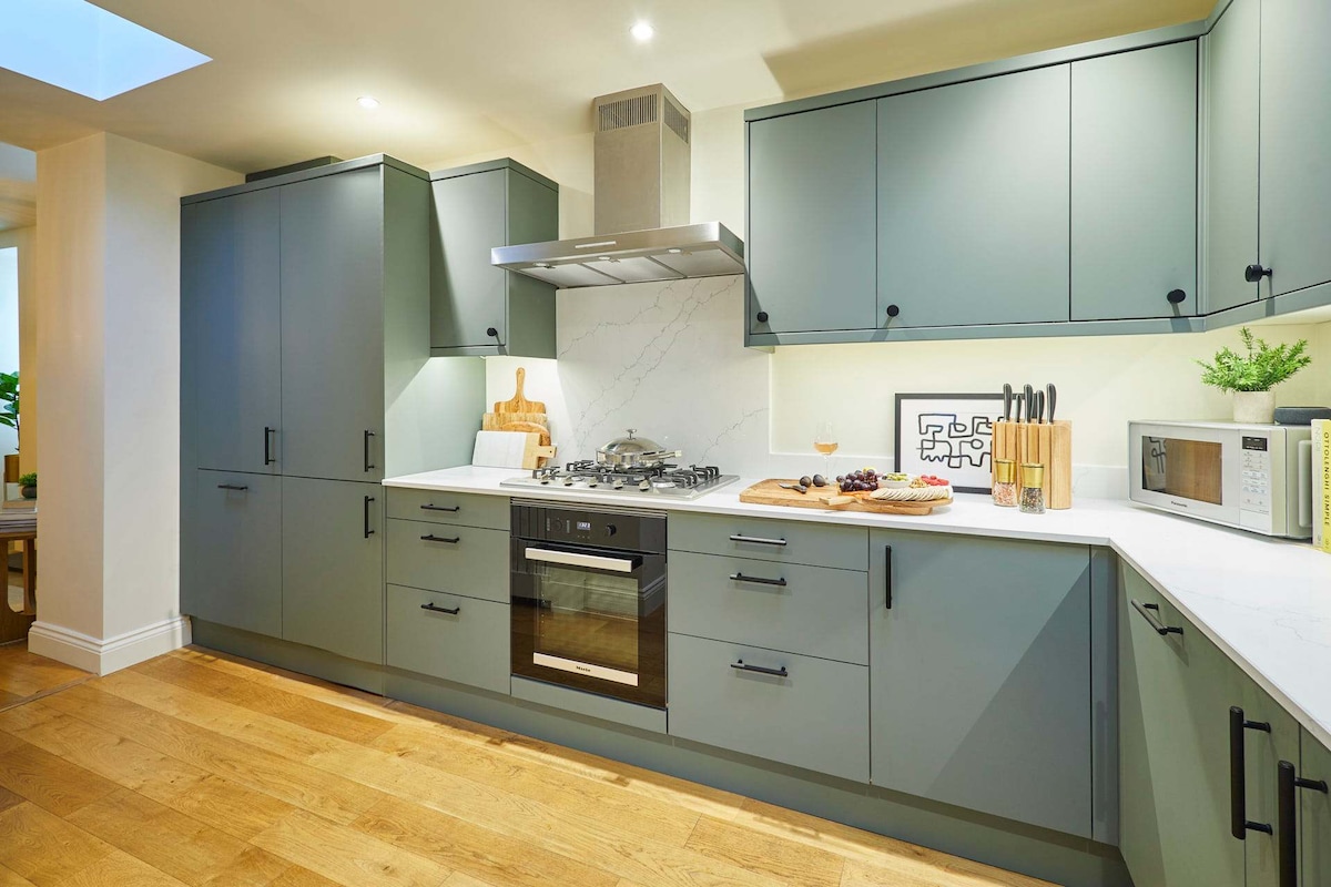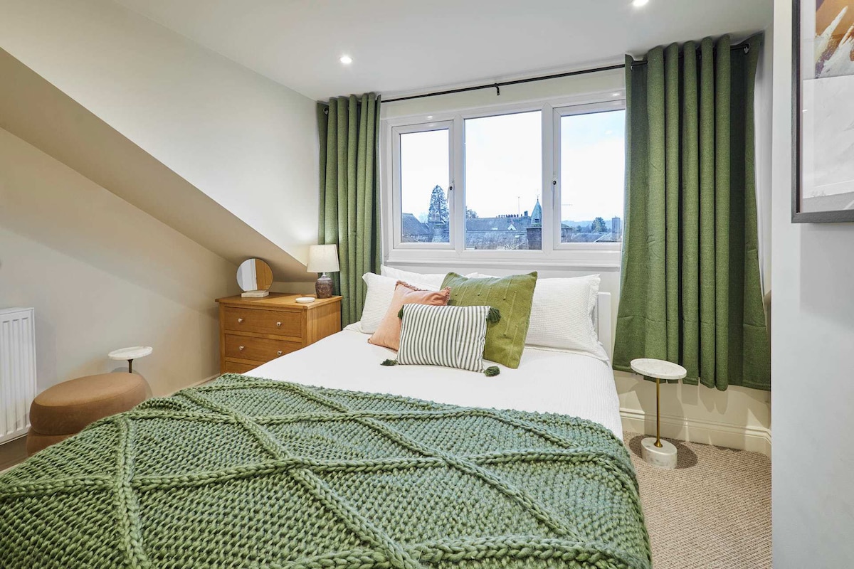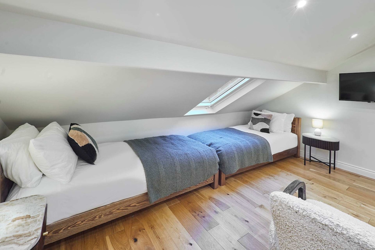The first bedroom is a spacious king room with large, panelled windows looking out to the front of the property. A perfect setup for little ones, the second bedroom has a single bunk bed and plenty of storage space. Upstairs on the second floor, there is a spacious king bedroom with an ensuite shower room and incredible views over the rooftops to the fells. Ideal for kids or friends, the last bedroom has two inviting twin beds and a sloped ceiling with skylight windows for the ultimate cosy space.