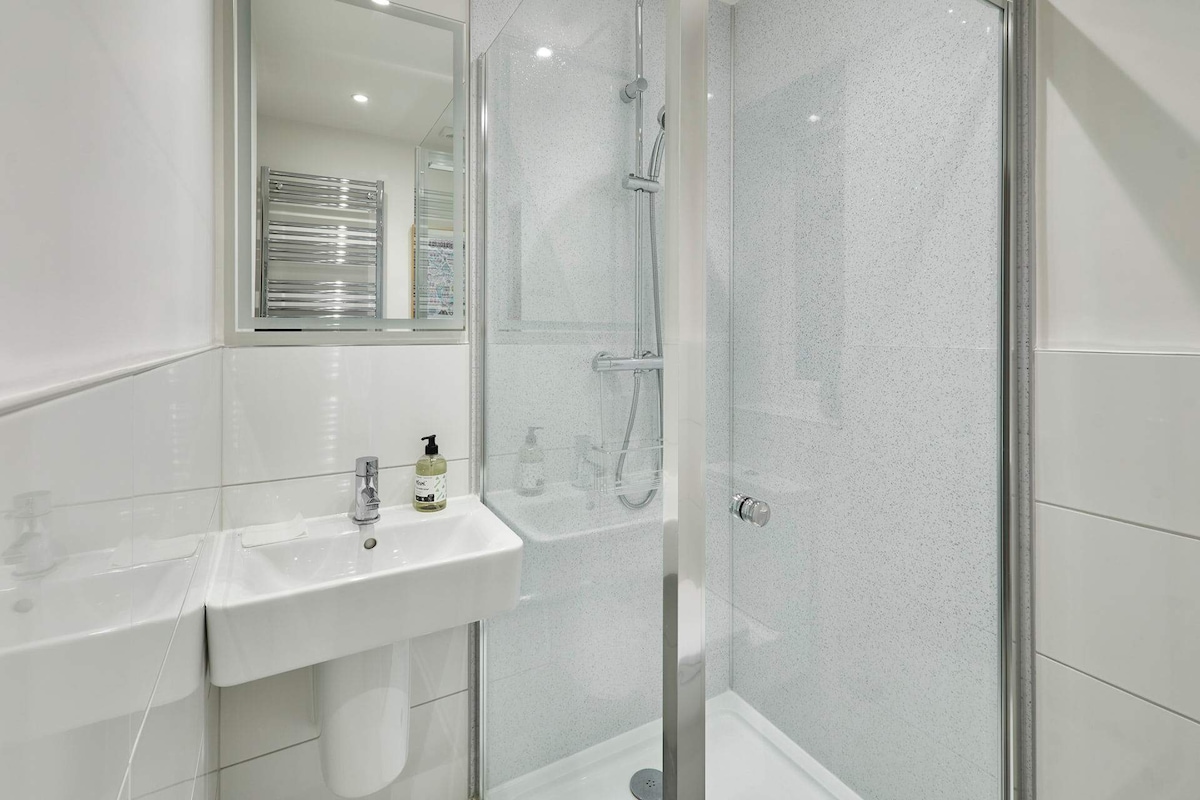Hovera Cottage has three sleek and modern bathrooms, including one en-suite, offering comfort and convenience throughout your stay. The ground floor shower room is a well-designed space with a walk-in shower, sink, and WC. Convenient for the entire family, the family bathroom offers a bathtub, a walk-in dual shower with a rain head and handset, sink, and WC. The second-floor king bedroom includes an en-suite bathroom with a shower, WC, and sink.