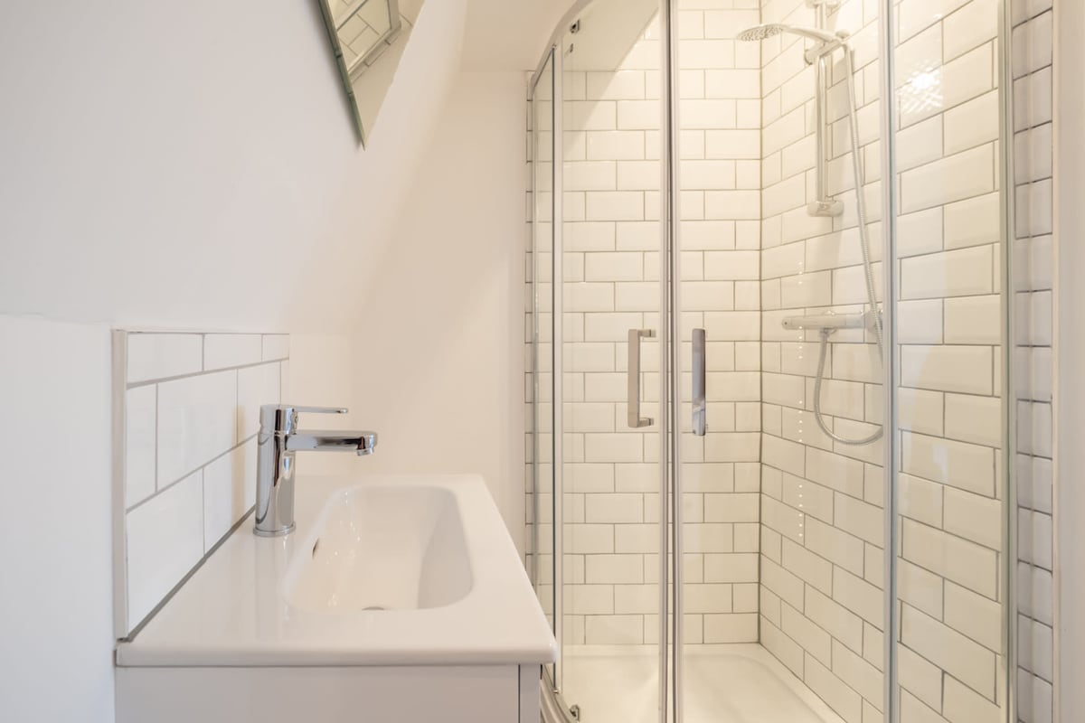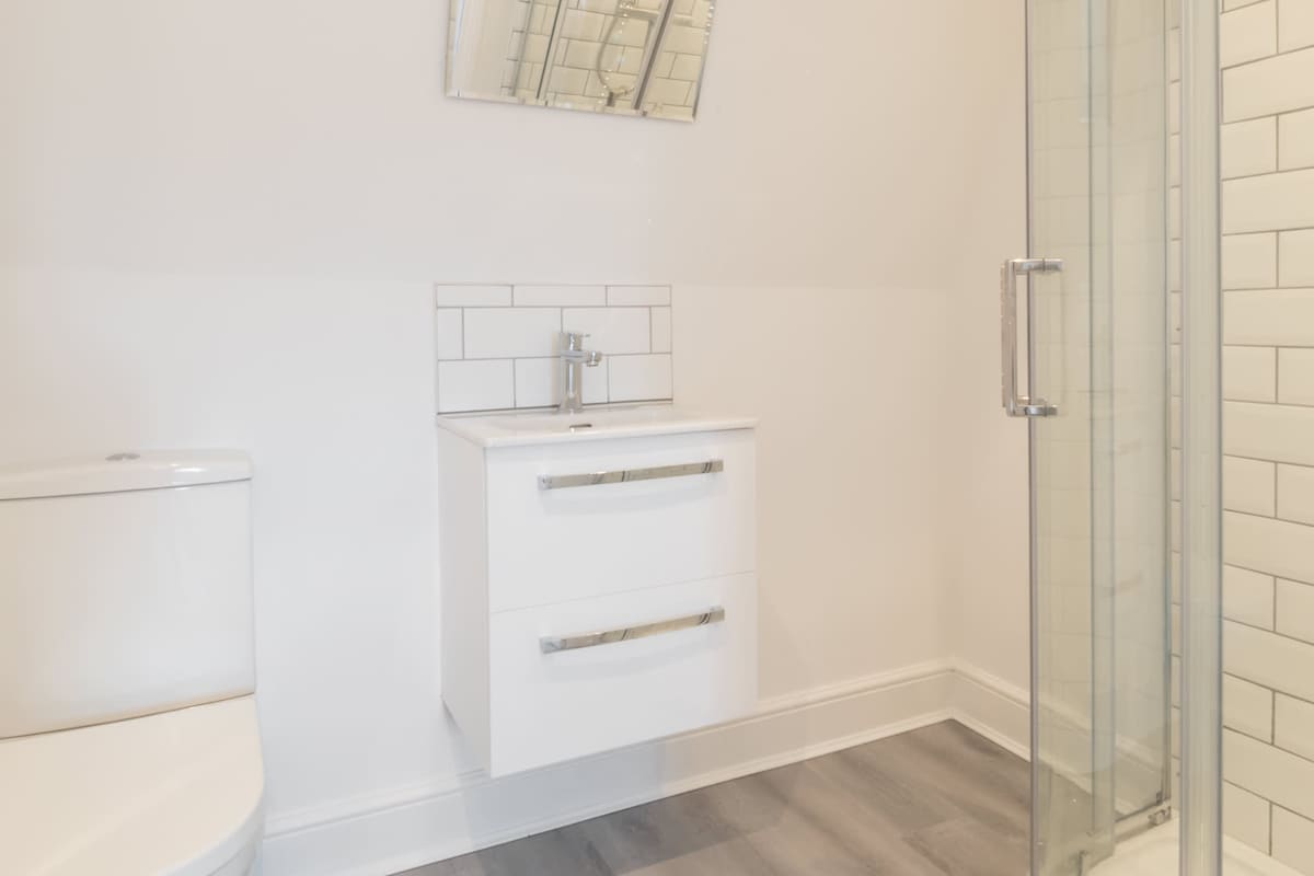 The ensuite bathroom is modern in design with a neutral colour palette. The space features a cubicle shower, WC and wash basin.