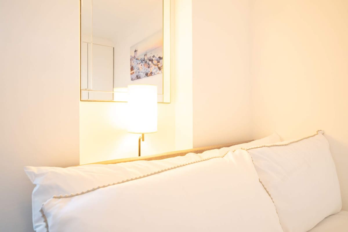Upstairs, the bedroom offers an inviting small double bedroom, complete with a lamp behind the bed, large wardrobe for storage, and minimalist décor to ensure a restful night’s sleep.