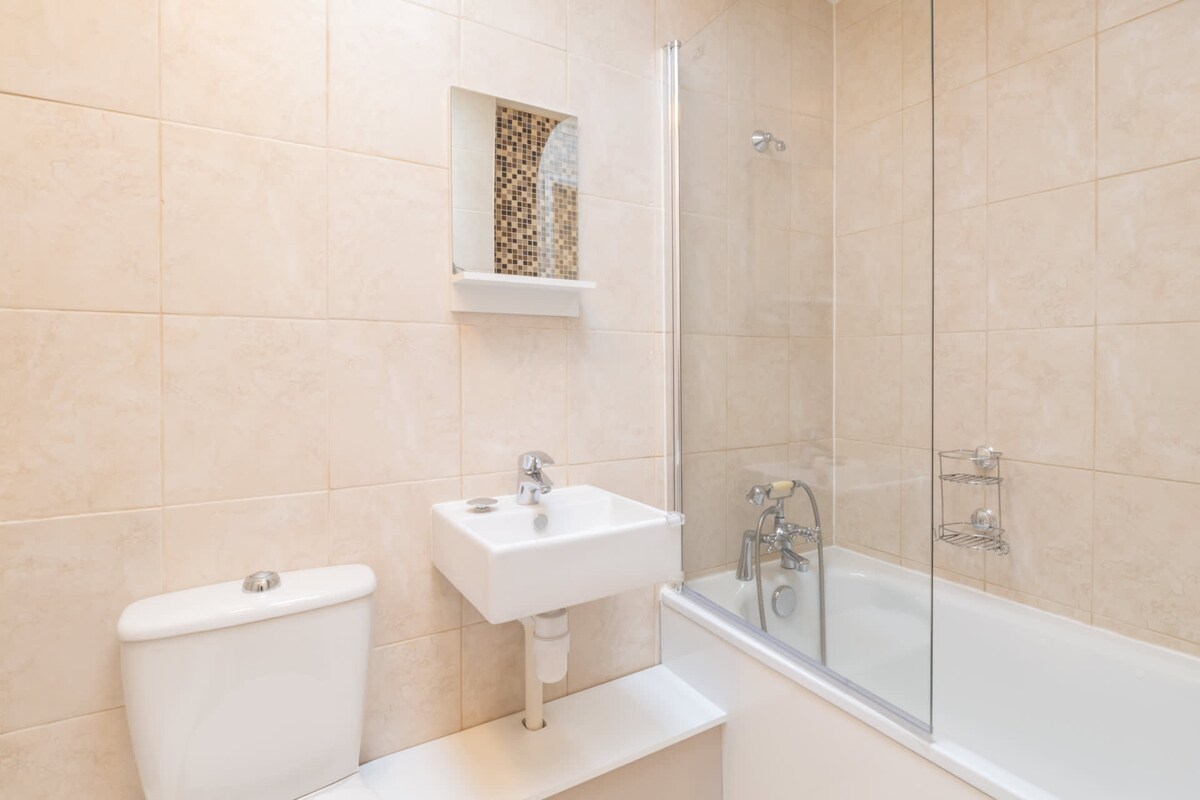 The bathroom features a bathtub with an overhead shower unit, WC and sink, ideal for a relaxing soak after a day of exploring Canterbury.