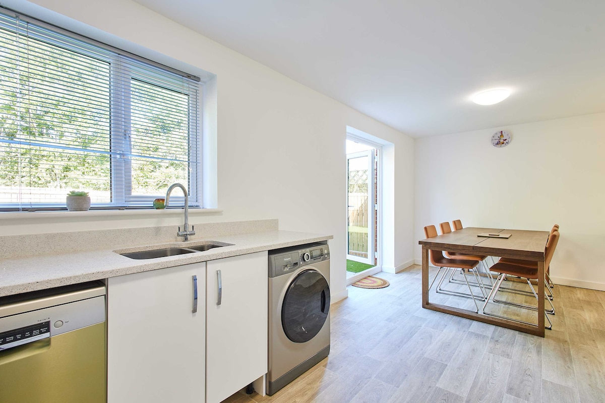 The modern and spacious kitchen is fully equipped with everything you could need for a self-catering stay. Sharing the kitchen space is a large dining area with a modern wooden table and leather chairs creating a lovely space for social cooking.